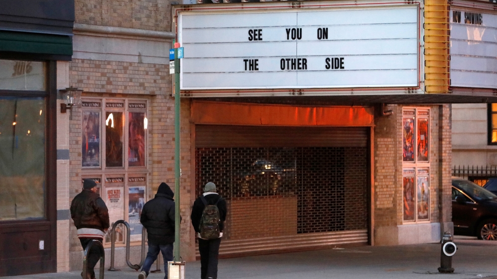 People walk by the Nitehawk cinema, in Brooklyn, NY, where all non-essential businesses shuttered on Sunday as the US battles the coronavirus amid warnings from some analysts that this economic fallout will be far worse than the Great Recession [Andrew Kelly/Reuters]