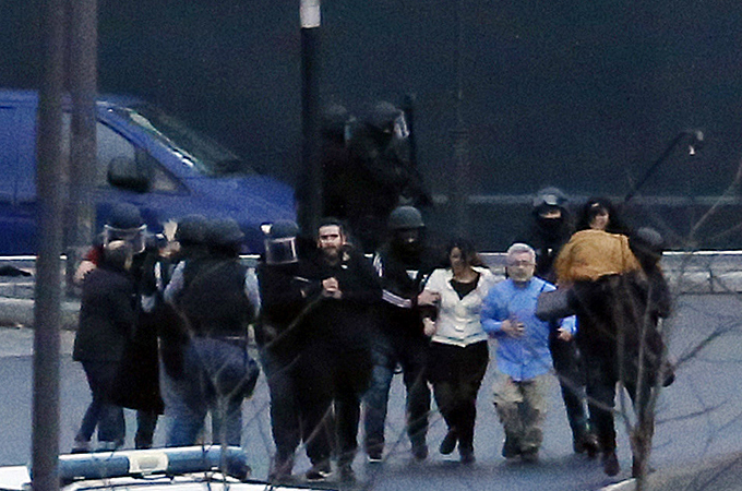 Three armed men and several hostages die, as assault by French police ends sieges at two different locations.