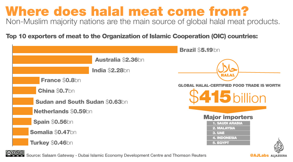 Similarly, New Zealand is also a leading exporter of halal meat despite its relatively small Muslim population, with sales of $576m.
