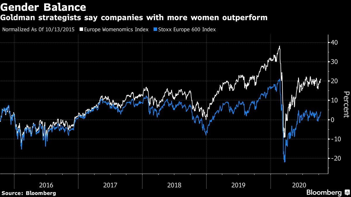Companies with a higher presence of female executives have historically rewarded their equity investors with better performance, said Goldman Sachs Group Inc. strategists as they unveiled a basket of European firms that employ an elevated number of women.