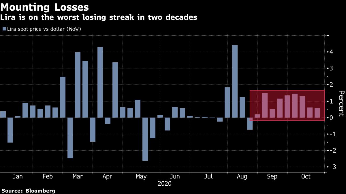 The Turkish lira is on its worst losing streak since 1999