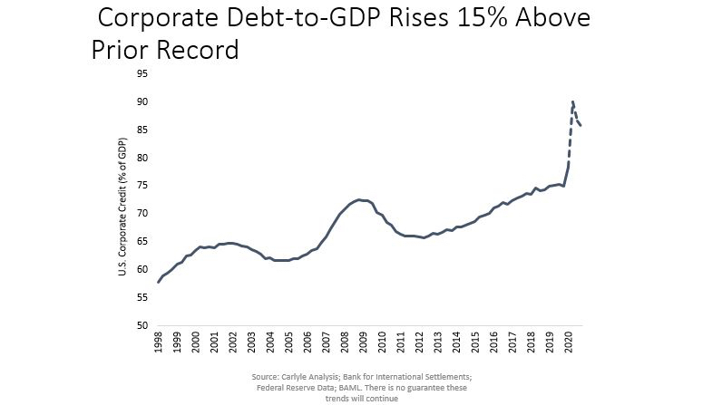 Corporate debt in the U.S. entered 2020 at all-time highs relative to GDP. When accounting for the incremental debt issued in 2020 and netting out restructurings, that ratio seems likely to increase by another 15% this year. Effective debt-service ratios remain at levels comparable to 2001 – and above those of 2009 – when default rates on senior loans hit 8%. Rather than a sharp peak and swift subsequent decline, default rates could remain at elevated levels for an extended period, with defaults that would have otherwise occurred in 2020 simply pushed into the future.