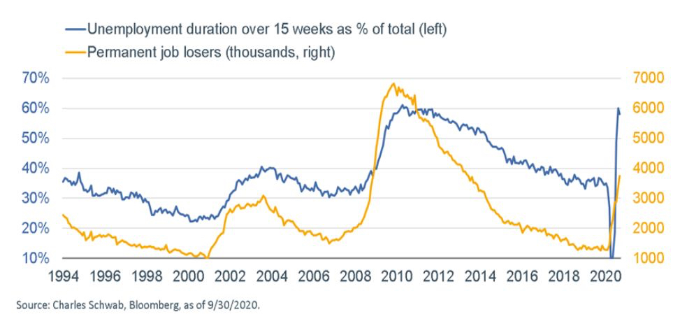 Although payroll gains since the April low reflect the re-hiring of temporarily unemployed Americans, the persistent increase in permanent job losses and the surge in the duration of unemployment are both testament to the deleterious longer-term impact of the virus on the economy.