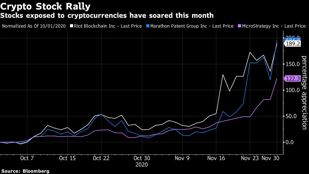 The world’s largest digital-asset rallied as much as 8.7% to $19,857.03 Monday, pushing this year’s surge to more than 170%, according to data compiled by Bloomberg. It traded at a few cents for several years after its late 2008 launch by an unknown software developer in the wake of the global financial crash. Shares of companies with exposure to cryptocurrencies also jumped, with Marathon Patent Group Inc. and Riot Blockchain Inc. each rising at least 22%. MicroStrategy Inc., a software company that has been buying Bitcoin, added 20%.