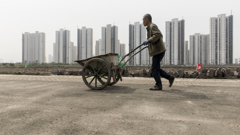 A worker pushes a wheelbarrow past a construction site for a secondary school at Hangzhou Bay New Zone in Ningbo, China [File: Qilai Shen/Bloomberg]