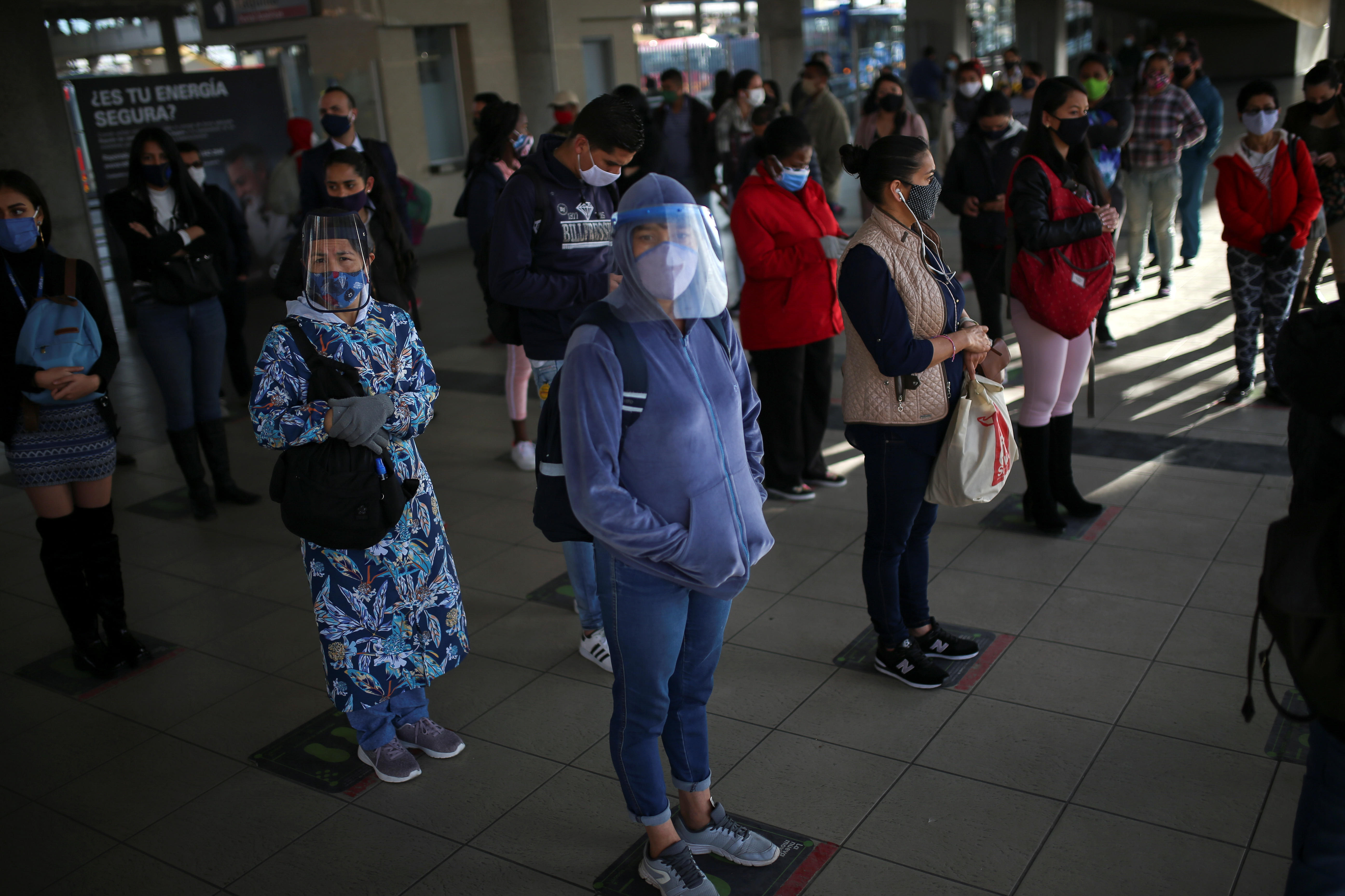 People wearing protective masks during the coronavirus outbreak in Bogota, Colombia, where the wider Latin American region is likely to be particularly hard hit with a drop in output this year of 7.6 percent [File: Luisa Gonzalez/Reuters]