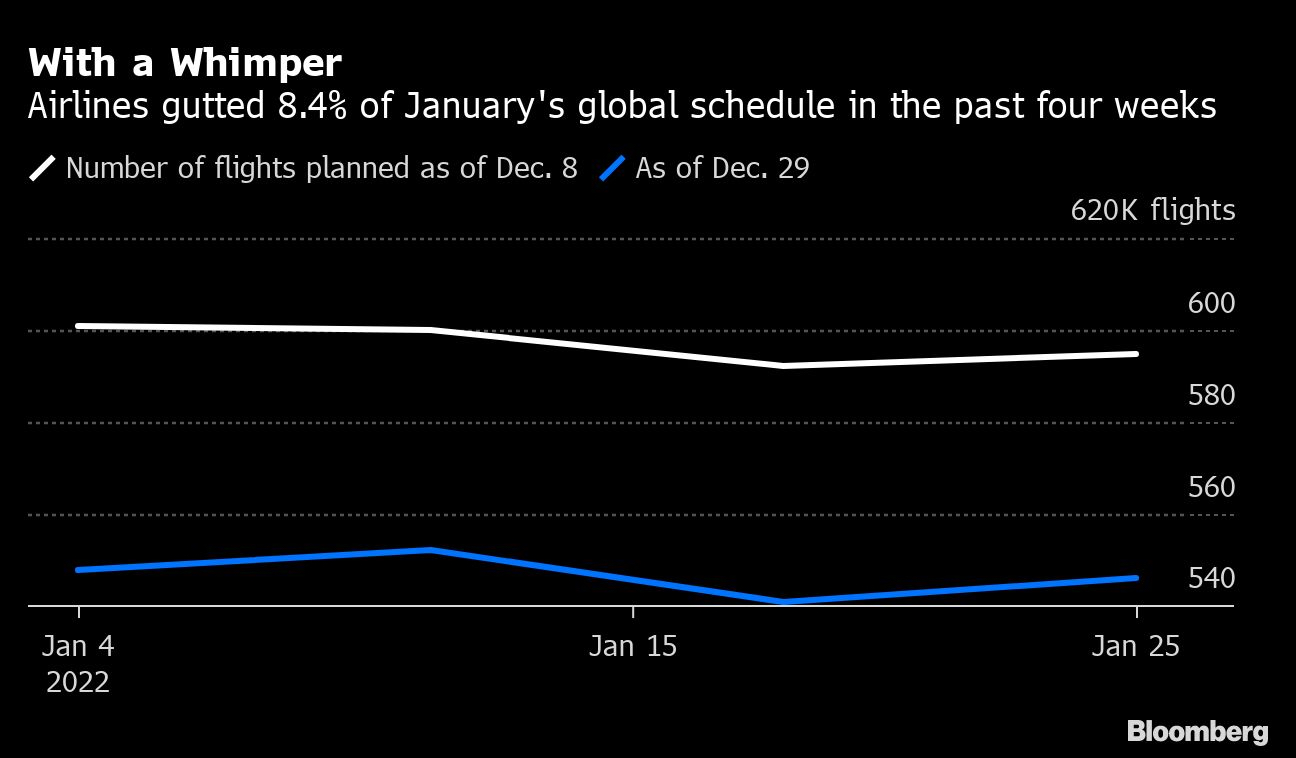The impact looks set to persist well into the new year. Airlines worldwide eliminated about 8.4% of the flights they had planned for January during the past four weeks, based on data from BloombergNEF, which tracks demand for jet fuel.