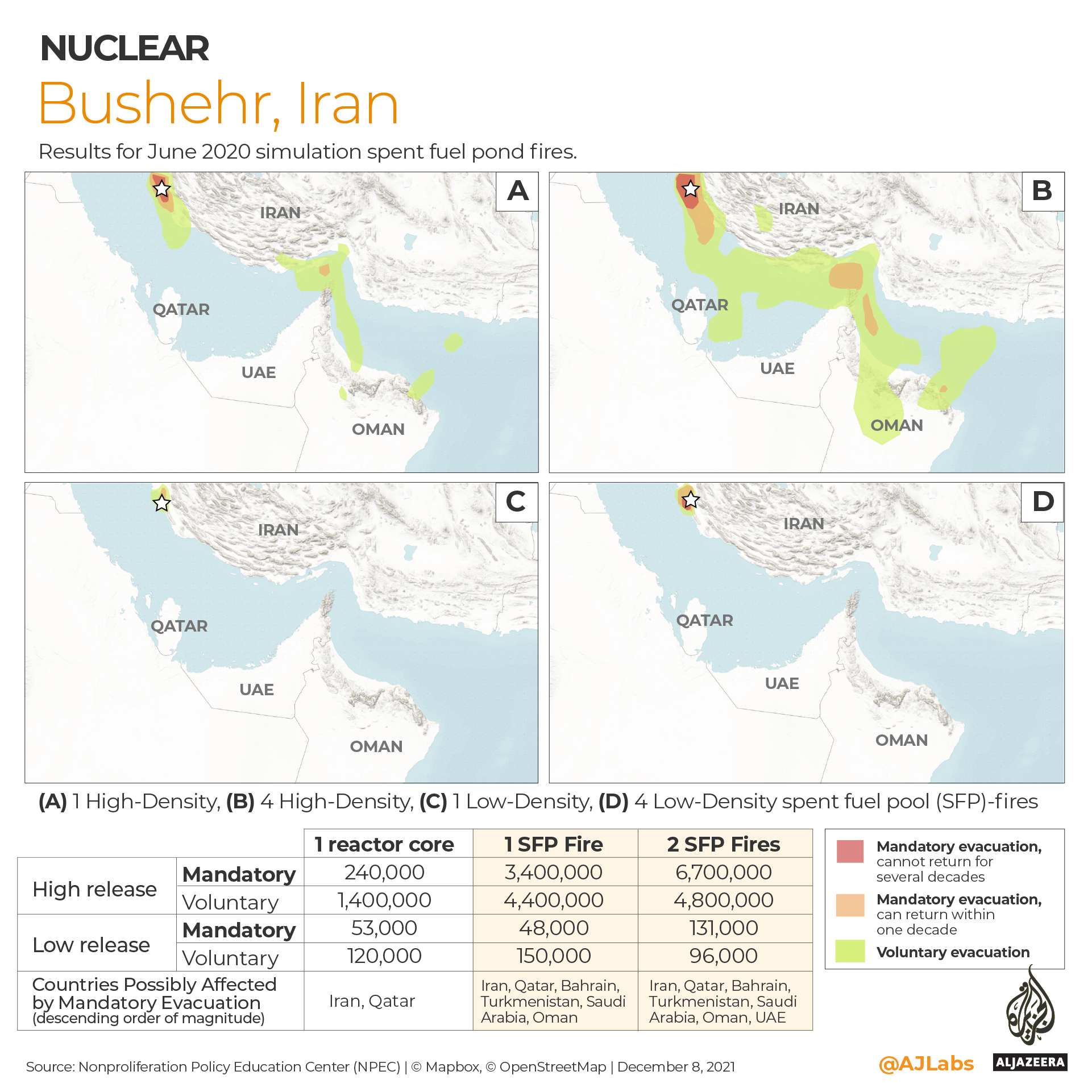 The three scenarios involving a missile or drone attack on the Bushehr nuclear power plant predicted average population displacements ranging from 53,000 mandatory and 120,000 voluntary evacuations in low-radiological release simulation involving a core breach, to 6.7 million mandatory and 4.8 million voluntary evacuations if a densely packed spent fuel pond is hit resulting in a high release of Cs-137.