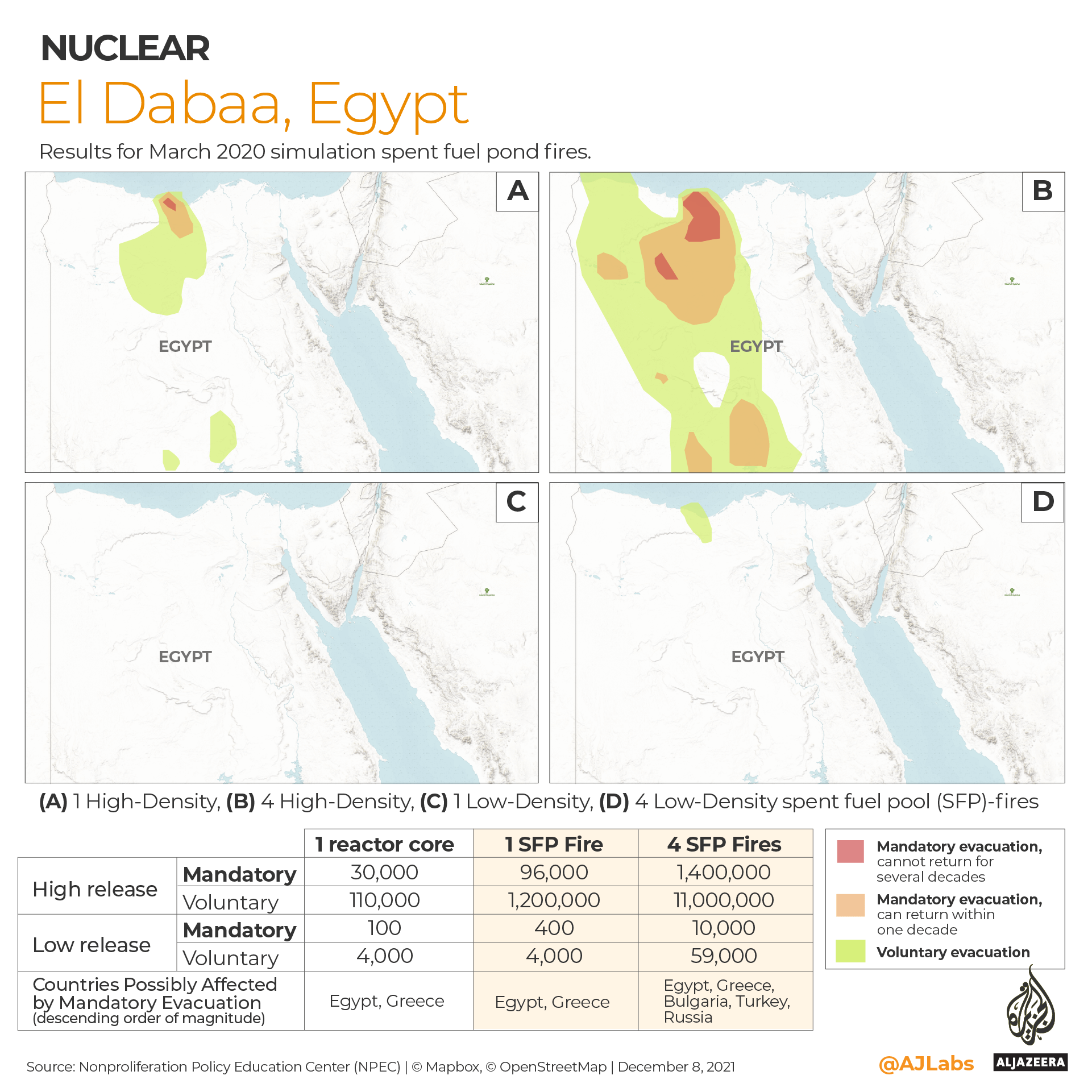 The three scenarios involving a missile or drone attack on the El Dabaa nuclear power plant predicted average population displacements ranging from 100 mandatory and 4,000 voluntary evacuations in low-radiological release simulation involving a reactor core breach, to 1.4 million mandatory and 11 million voluntary evacuations if a densely packed spent fuel pond is hit resulting in a high release of Cs-137.