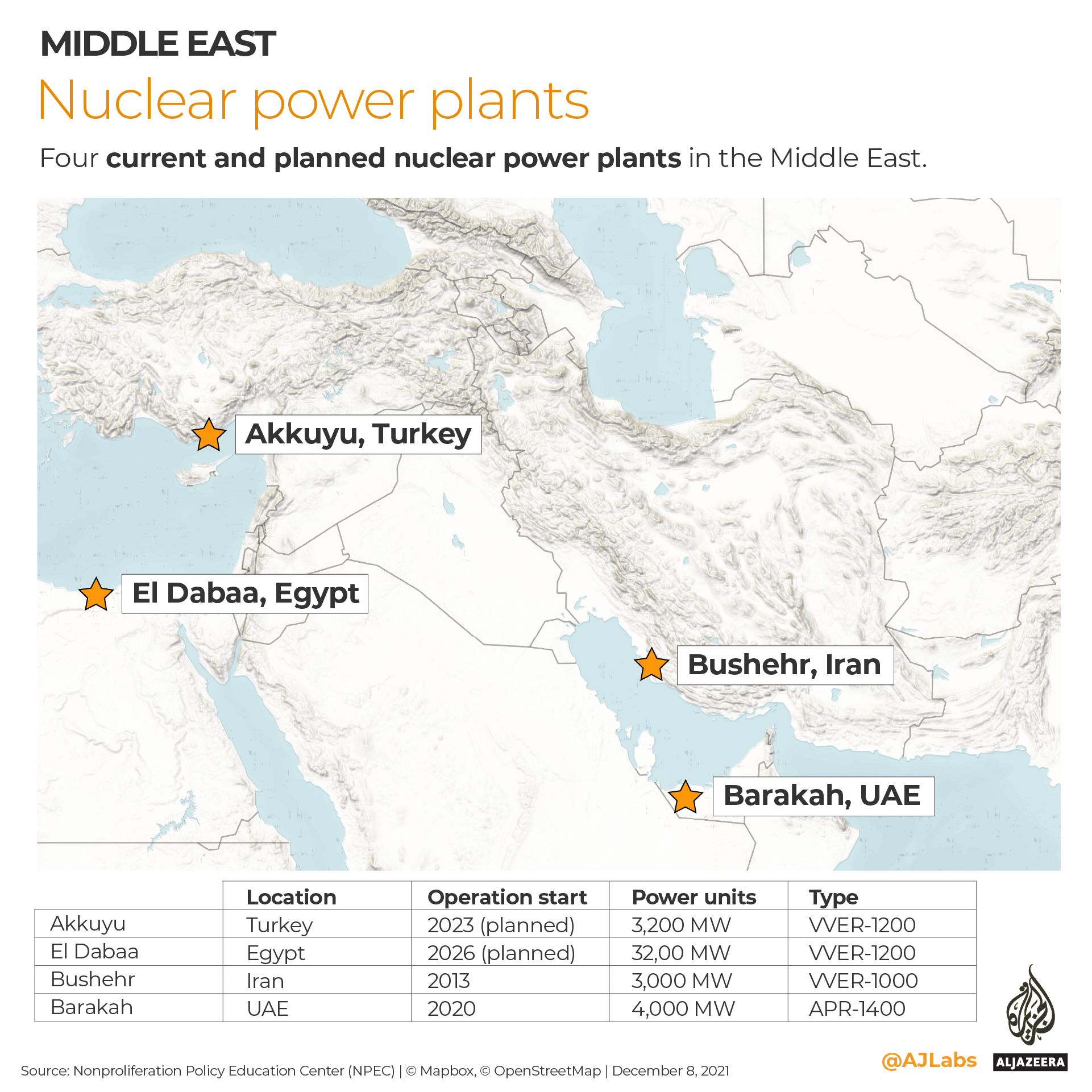 The four facilities chosen for the scenarios include the UAE’s Barakah power plant, Iran’s Bushehr, the plant under construction at Akkuyu in Turkey, and the site of Egypt’s planned commercial nuclear power station at El Dabaa.