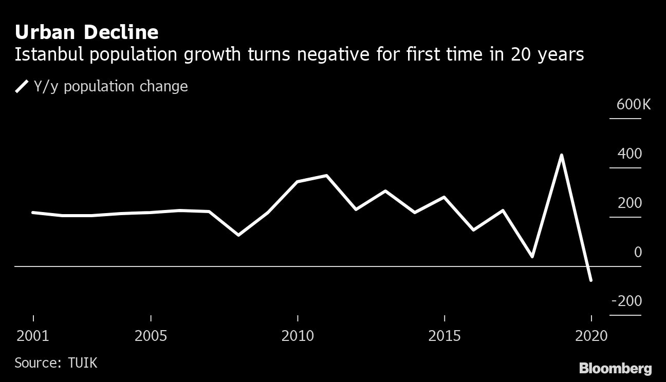 Istanbul’s population fell last year for the first time in at least two decades as coronavirus lockdowns shuttered Turkey’s commercial capital and attracted people to the countryside.