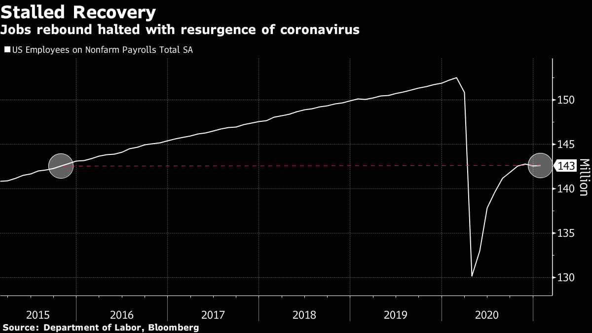 Expectations for stimulus helped investors look past the Labor Department’s report, which also showed total employment down almost 10 million compared with the pre-pandemic peak. The S&P 500 Index headed for a record close on Friday, up 0.6% as of 12:56 p.m.