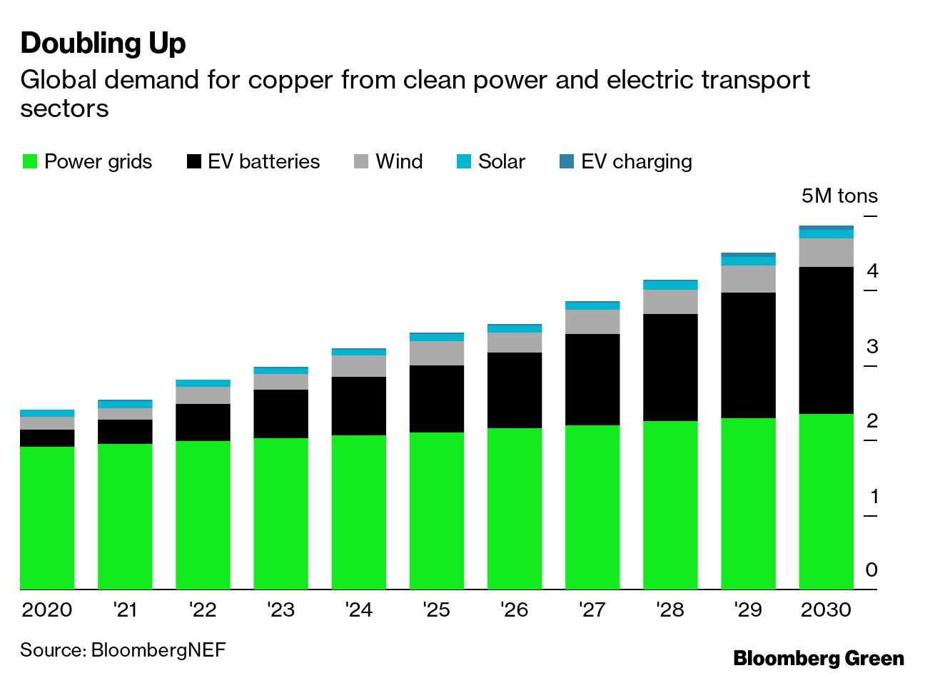 The world’s metals producers stand to benefit from increasing electrification, and not just in the transport sector. BloombergNEF estimates that global copper demand in both the clean power and the clean transport sectors will double in the next decades, to almost 5 million tons per year. Copper demand this year is expected to be about 24 million tons, so that jump would be a material increase.