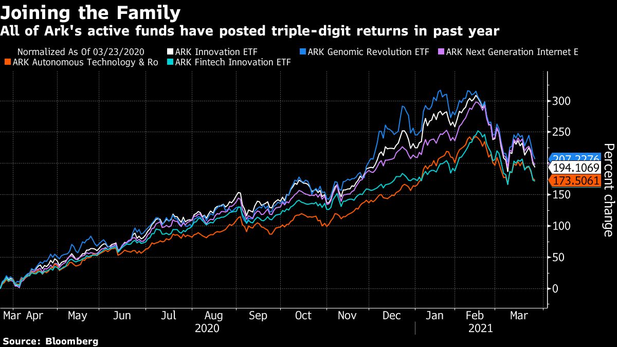 Her funds – which include five that are actively-managed and two that track indexes – had a rough ride as tech shares sold off in recent weeks. But the flagship fund is still up 154% over the past 12 months and her products have taken in about $16.4 billion just this year, suggesting a new one would be met with strong demand.