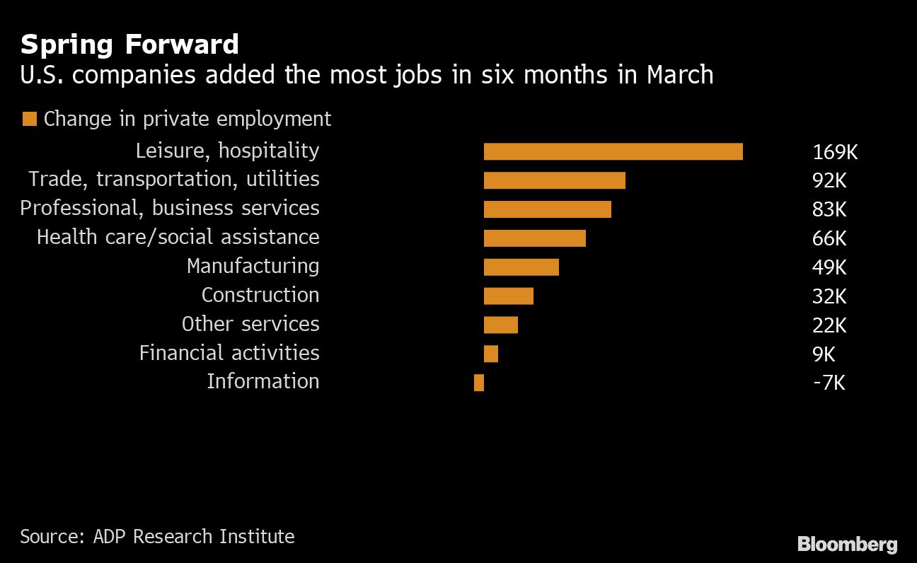 U.S. private employers in March added the most jobs in six months, signaling that a pickup in Covid-19 vaccinations and business reopenings are encouraging hiring.