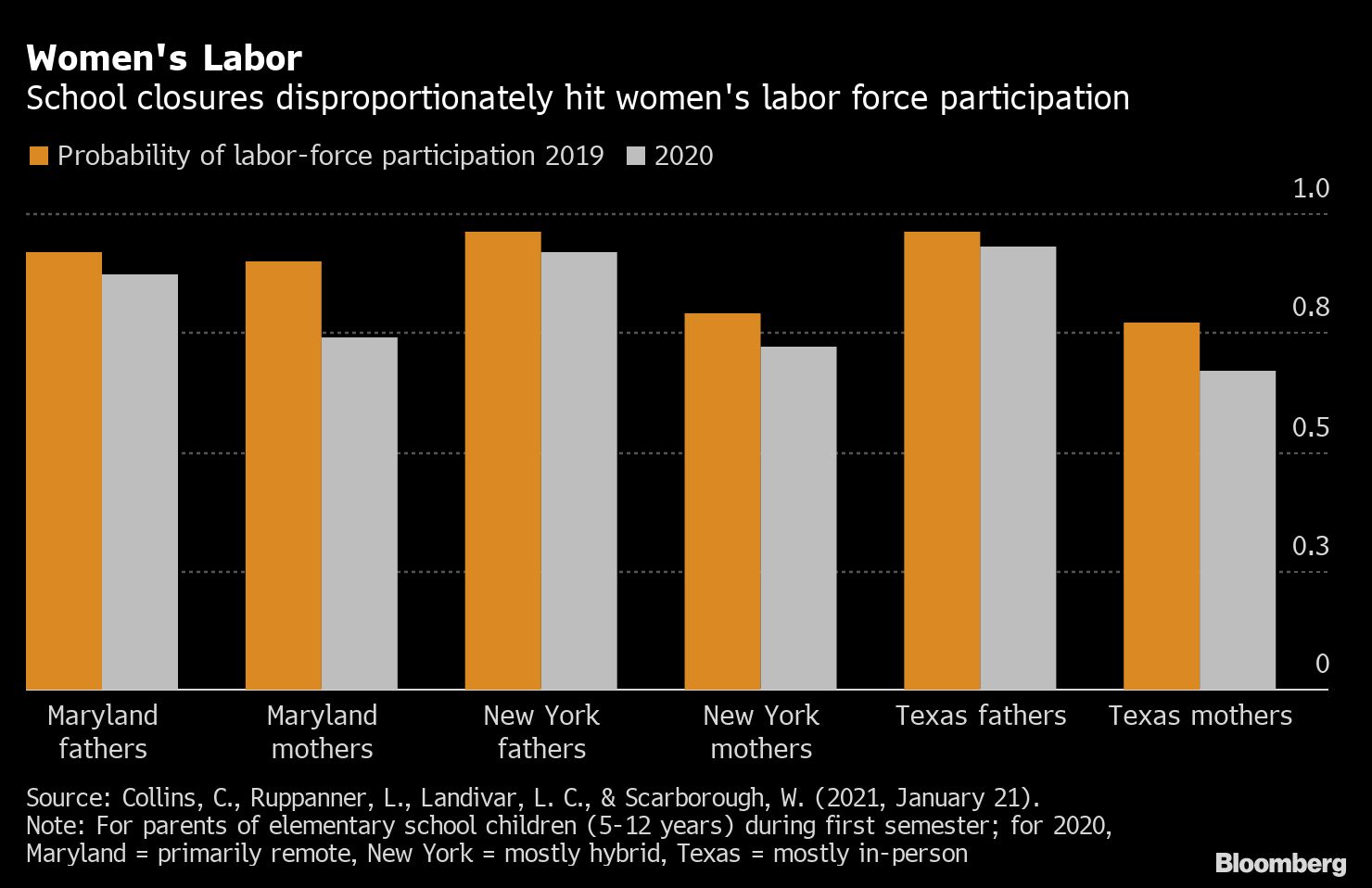 Researchers calculated labor rates for mothers and fathers with at least one elementary-age child. They compared the September through November time period in 2019 against 2020, controlling for race, age, marital status and education in 26 states, and honed in on three states: Maryland, where school was mostly remote; New York, which was a mix of remote and in-school; and Texas, where more than half of districts offered elementary students the option of full-time, in-person classes.
