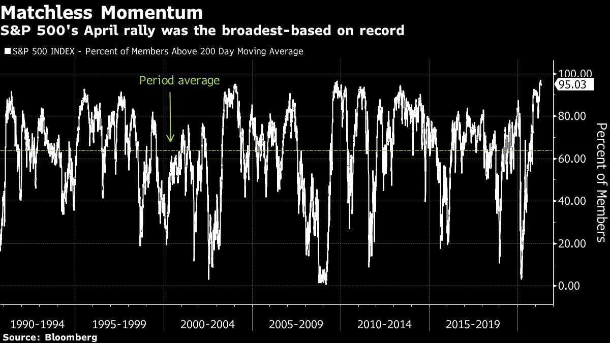 The S&P 500 has had better months, but never before has a rally been so widespread, according to one measure tracked by Bloomberg. During 18 sessions in April through trading on Thursday, 95% or more of the index’s members traded above their 200-day moving average.