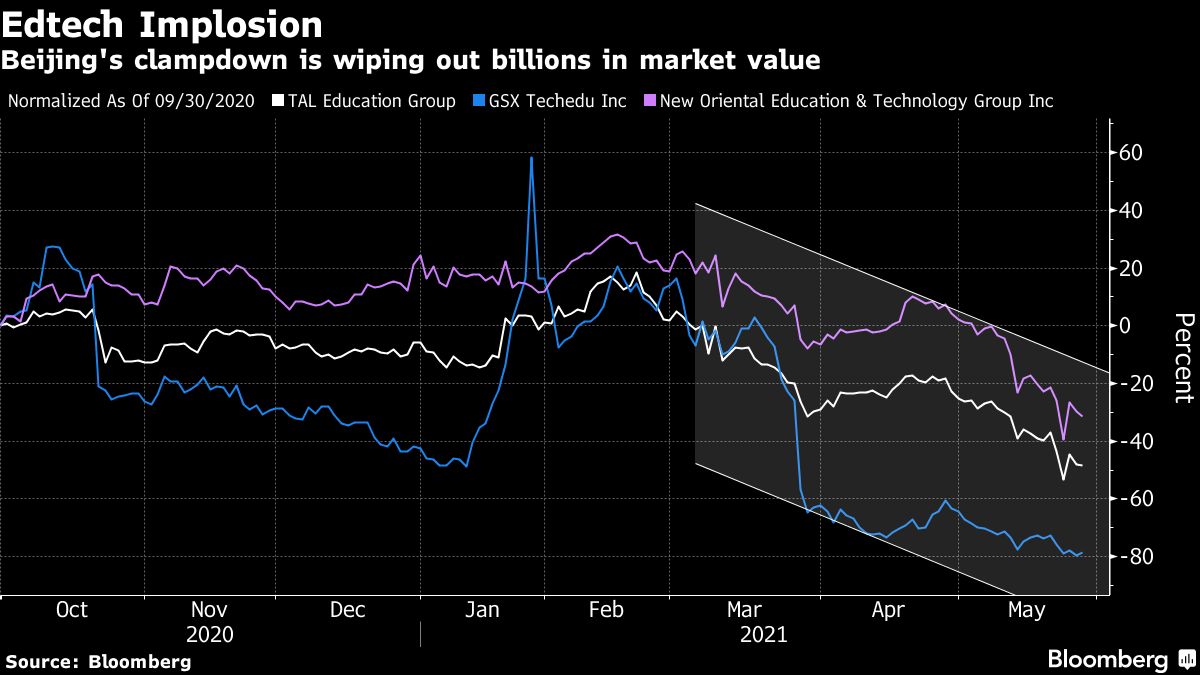 The fallout was swift. GSX Techedu Inc., New Oriental Education & Technology Group Inc. and TAL Education Group — which mainly operate physical schools but serve as barometers of industry sentiment — have shed $55 billion of value since the start of March. Investors from SoftBank and Sequoia to Hillhouse Capital and Tiger Global, among the biggest proselytizers of past years, have been sideswiped by the ferocity of the regulatory clampdown and have in many cases been forced to pull back from lucrative exits.