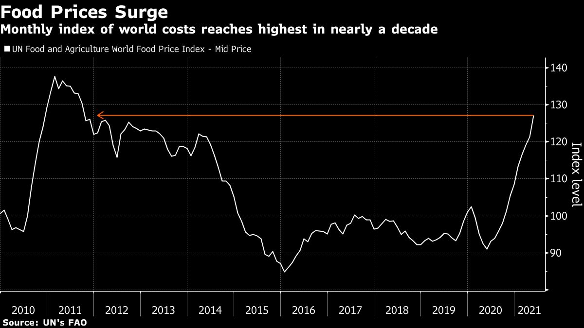Global food prices extended their rally to the highest in almost a decade, heightening concerns over bulging grocery bills as economies struggle to exit the Covid-19 crisis.
