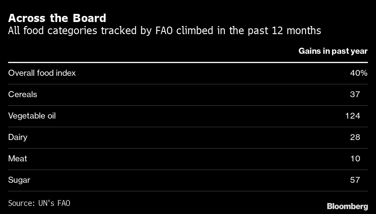 The UN’s index is treading at its highest since September 2011, with last month’s gain of 4.8% being the biggest in more than 10 years. All five components of the index rose during the month, with the advance led by pricier vegetable oils, grain and sugar.
