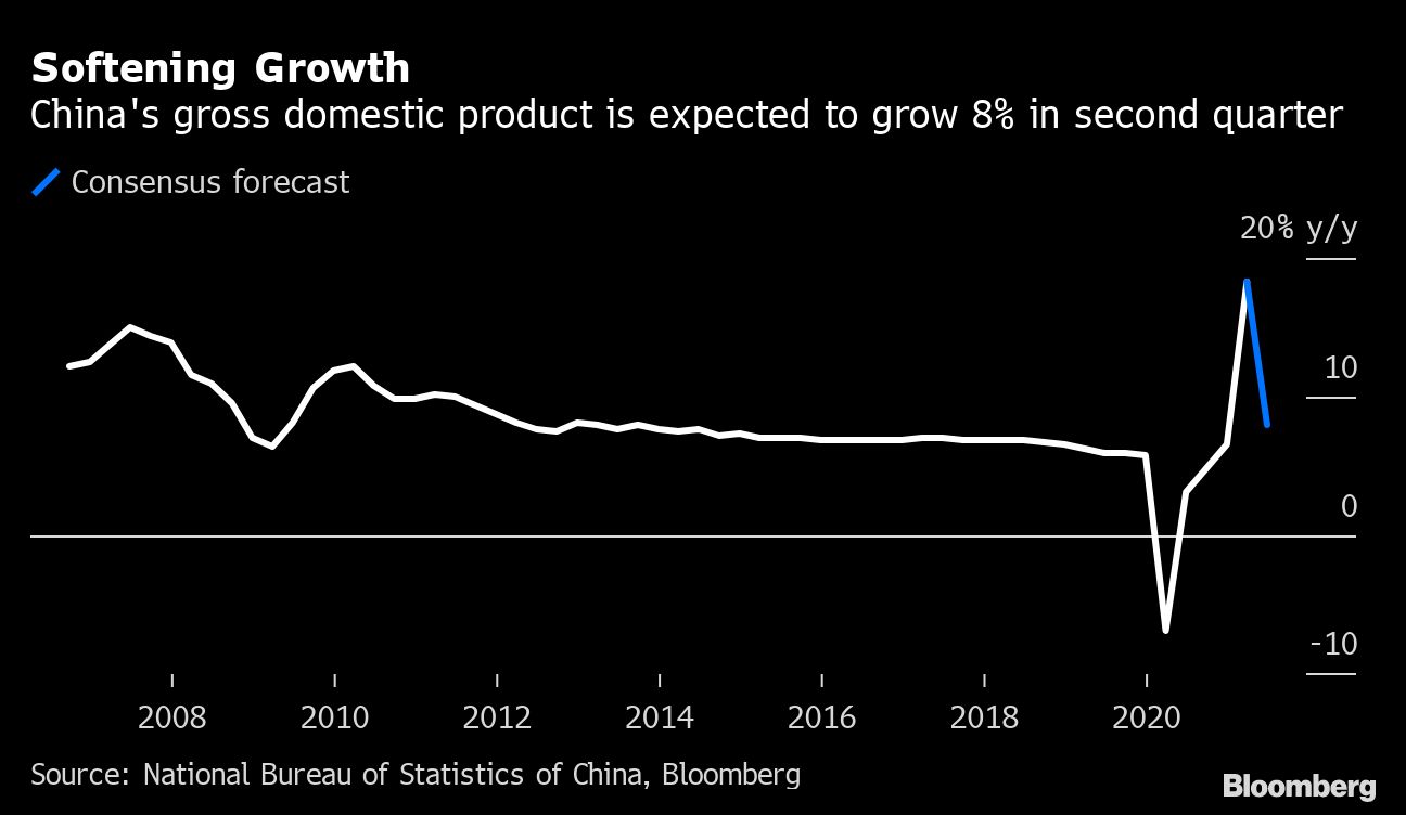 Data on Thursday is expected to show growth eased in the second quarter to 8% from the record gain of 18.3% in the first quarter, according to a Bloomberg poll of economists. Key readings of retail sales, industrial production and fixed asset investment are all set to moderate too.