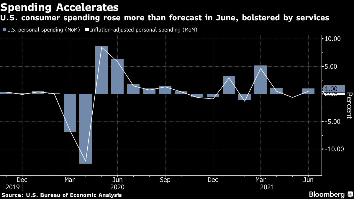 Purchases of goods and services increased 1% from a month earlier, following a downwardly revised 0.1% drop in May, Commerce Department figures showed Friday. The personal consumption expenditures price gauge, which the Federal Reserve uses for its inflation target, rose 0.5% for a second month.