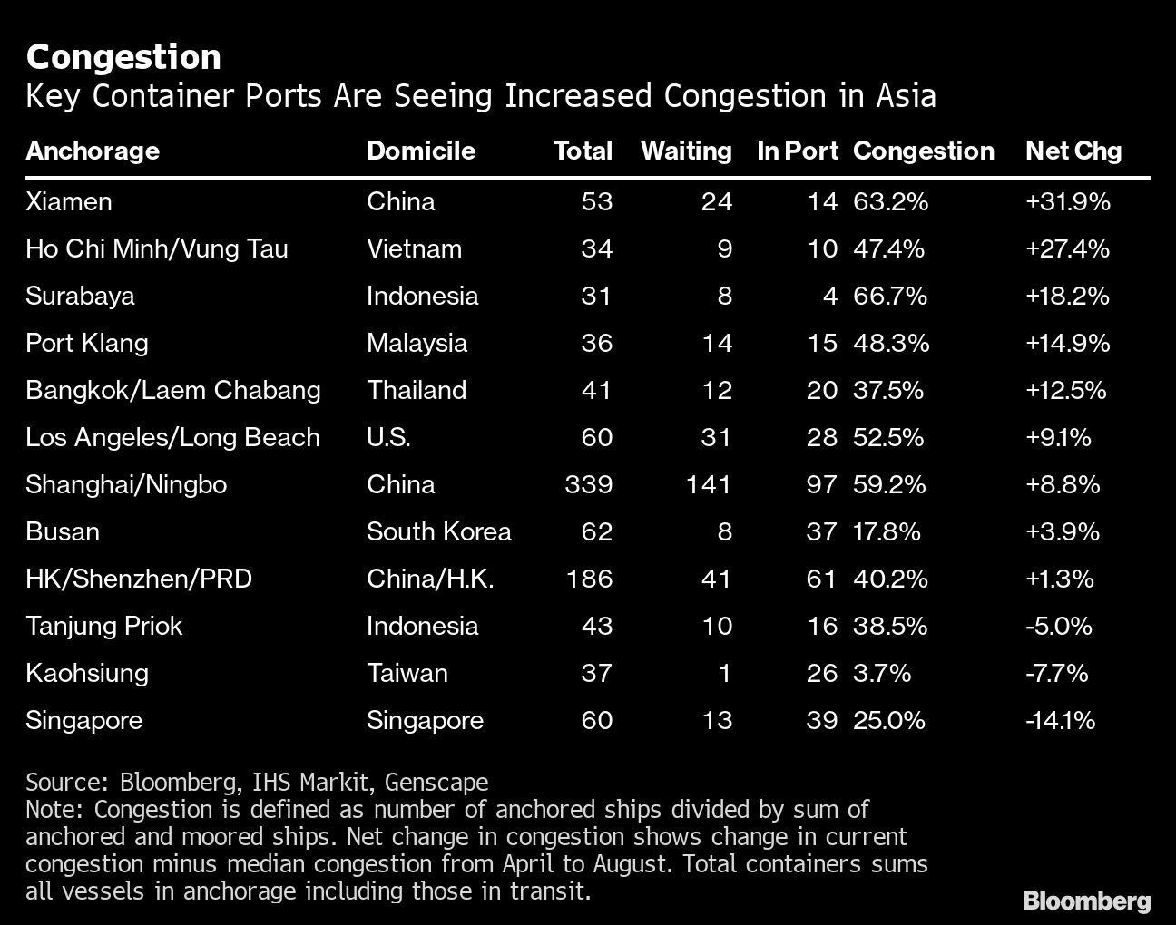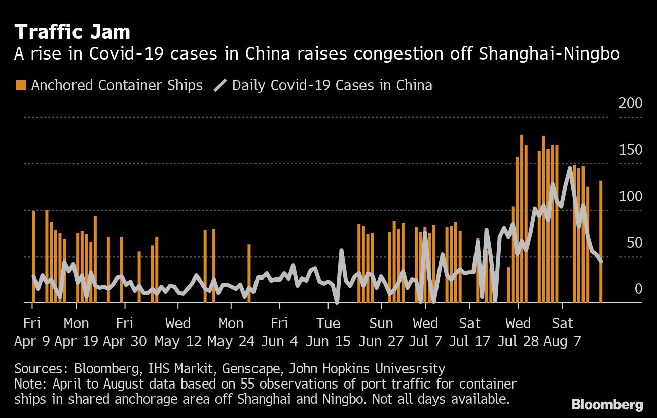 In nearby Shanghai and in Hong Kong, congestion is once again increasing after dropping due to the reopening of Yantian port in Shenzhen, which shut in May for a separate outbreak. The number of container ships anchored off Xiamen on China’s southeast coast rose to 24 Tuesday from 6 at the start of the month, according to shipping data compiled by Bloomberg.