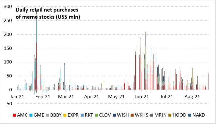 “Despite the broad rally in meme stocks, retail purchases were mainly concentrated on AMC, with over $56 million in Tuesday’s session,” Vanda’s Ben Onatibia and Giacomo Pierantoni wrote in a note. “All other meme stocks combined, totaled a paltry $4 million in net retail buying.”