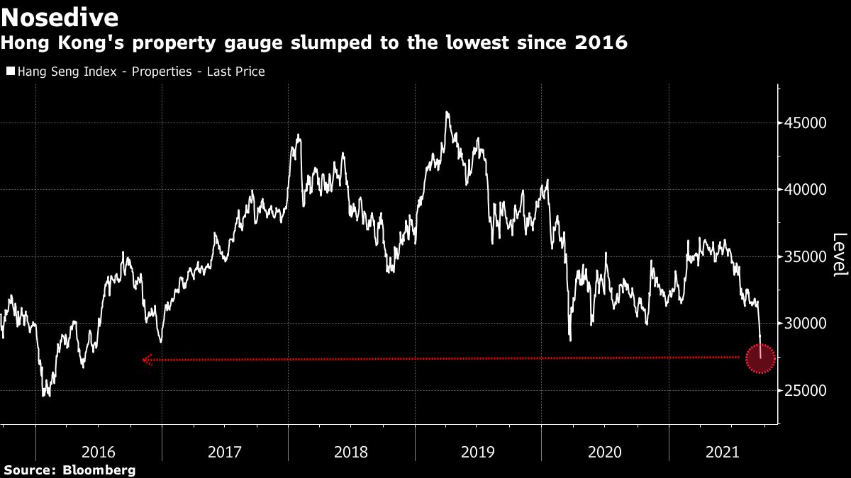 The Hang Seng Property Index tumbled 6.6 percent, the most since May 2020. Henderson Land dropped 12 percent. Sun Hung Kai Properties Ltd slumped 9.1 percent, poised for its biggest loss since 2016. CK Asset Holdings Ltd sank 7.9 percent.