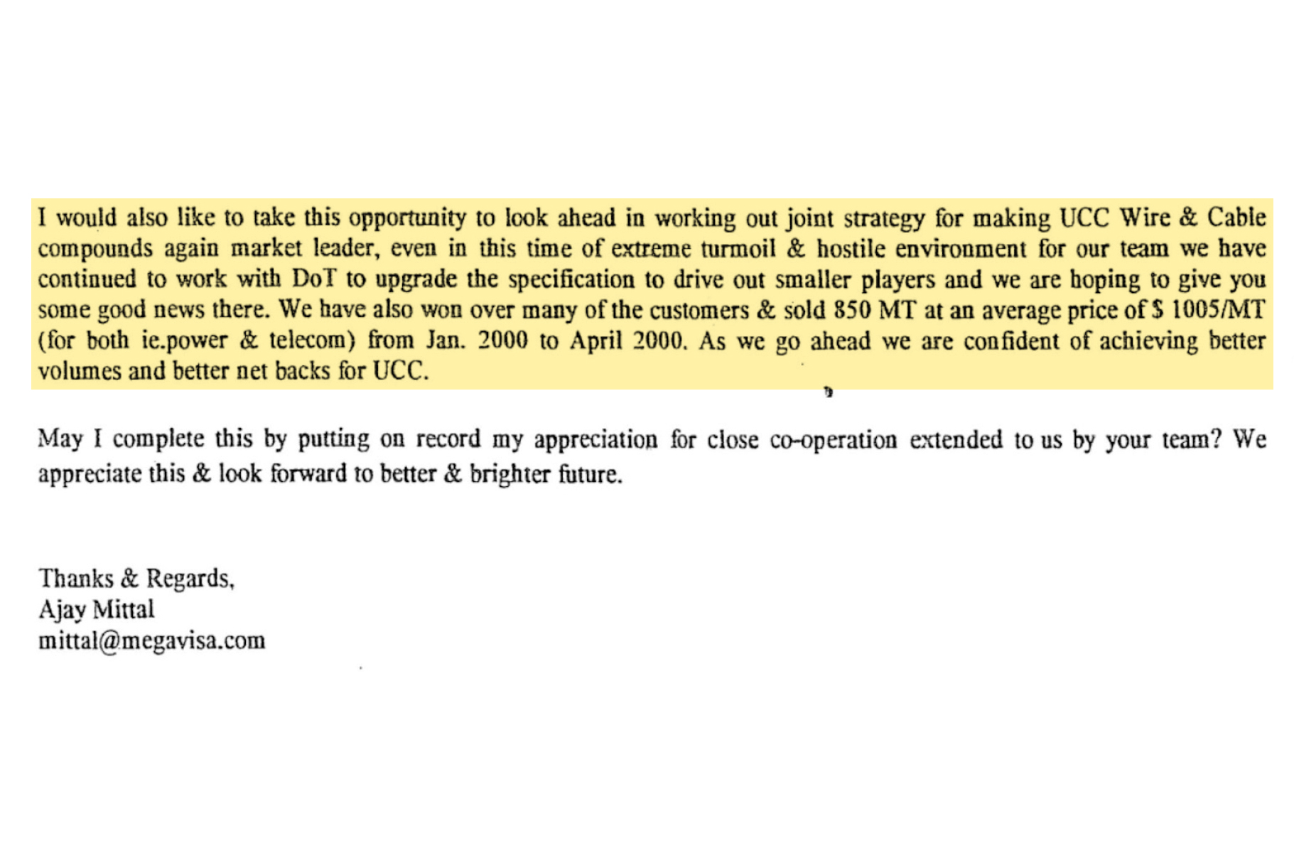 “Even in this time of extreme turmoil & hostile environment for our team we have continued to work with DoT,” Mittal said in an email to a UCC official on May 5, 2000. He also notes that MegaVisa’s work with DoT will help “drive out smaller players”. “As we go ahead we are confident of achieving better volumes and better netbacks for UCC,” he wrote.