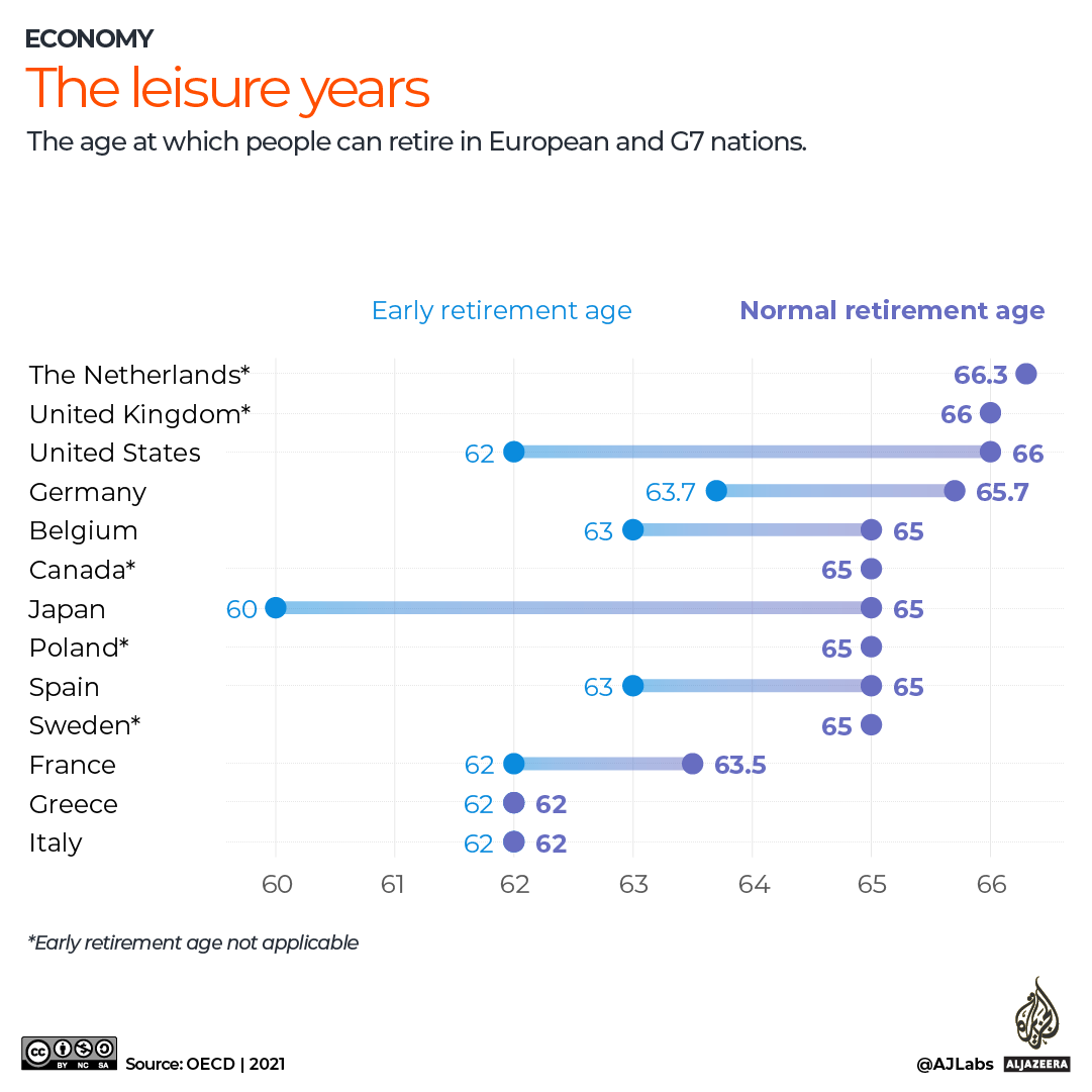 “There is a strong cultural attachment to state provision of pensions and also to quality of life which the French rate highly in terms of years worked but also working hours per week, days of holiday per year, and so on,” Rainbow Murray, professor at Queen Mary University London’s School of International Relations, told Al Jazeera. “Retirement, at an age and level of finance where it can be enjoyed, is seen as a right.”