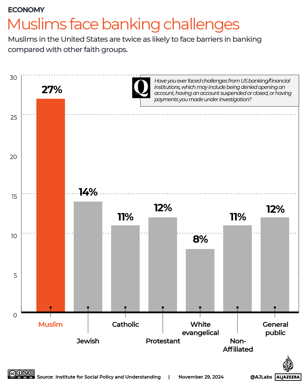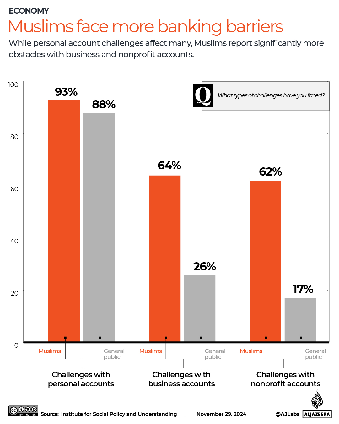 “As we note in our report, it is rather remarkable that one in three Muslims aged 30 to 49 has experienced difficulties when dealing with financial institutions. This statistic is especially alarming as this is the age cohort that is most likely to start businesses and purchase homes, but they are being prevented from fully participating in the American economy,” Chouhoud says.