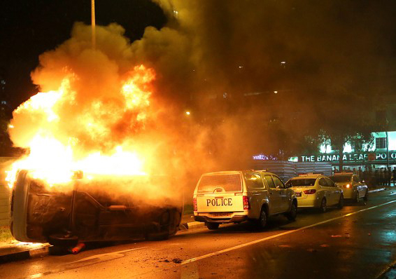 | Riot policemen watch burning vehicles in Little India [Reuters] |