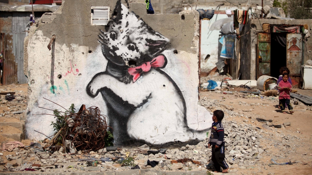 British graffiti artist’s work appears on walls throughout the besieged Palestinian territory.