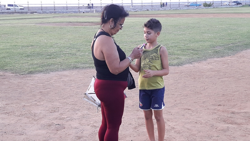 Mirta uses the wi-fi in a park in the Havana neighbourhood of Vedado to make a video call to Anibal’s parents. On the screen of her smartphone, Anibal’s parents cry. Mirta tries to be encouraging. She gives Anibal the phone so that he can speak to them.