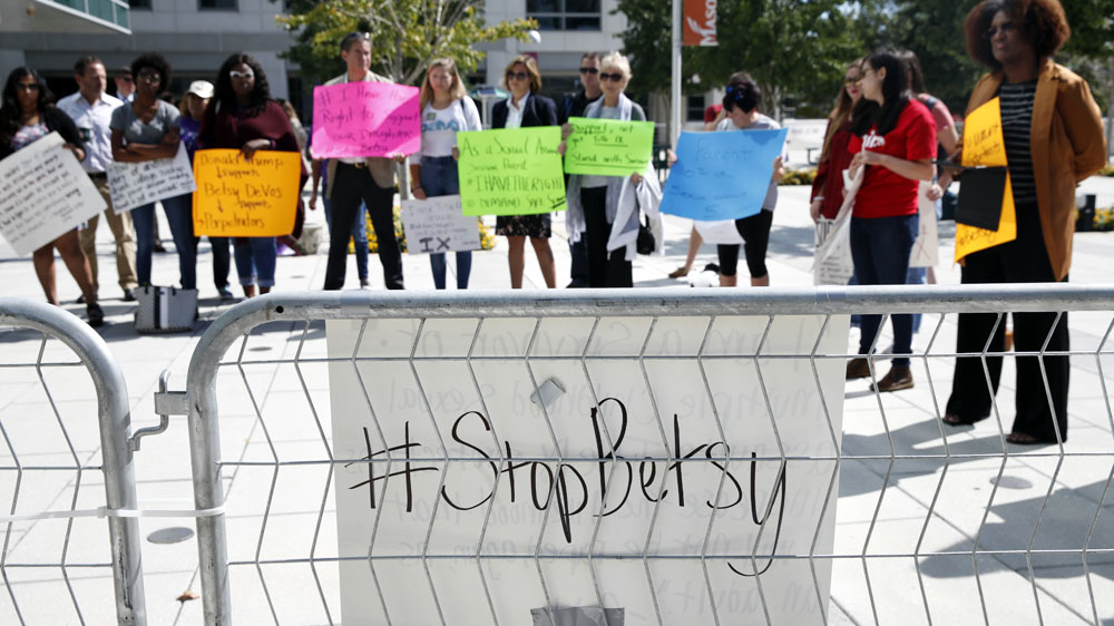 The Department of Education contested those claims in a statement to Al Jazeera. “The Secretary, as well as her team in the office for Civil Rights, have met many times with sexual assault survivors and the groups that represent them, those who have been falsely accused under Title IX, and university presidents, general counsels and others who are charged with enforcing Title IX on their campuses,” said Liz Hill, the press secretary for the department. “Those conversations started before the [July] Title IX summit and continued after.”