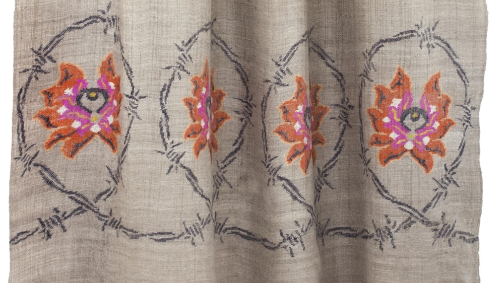 Cashmere scarfs are usually embroidered with flowers and birds, but the artists Mahum Shabir and Mir Suhail wanted to challenge conventional representations of Kashmir and its crafts by designing scarfs with barbed wire and guns.