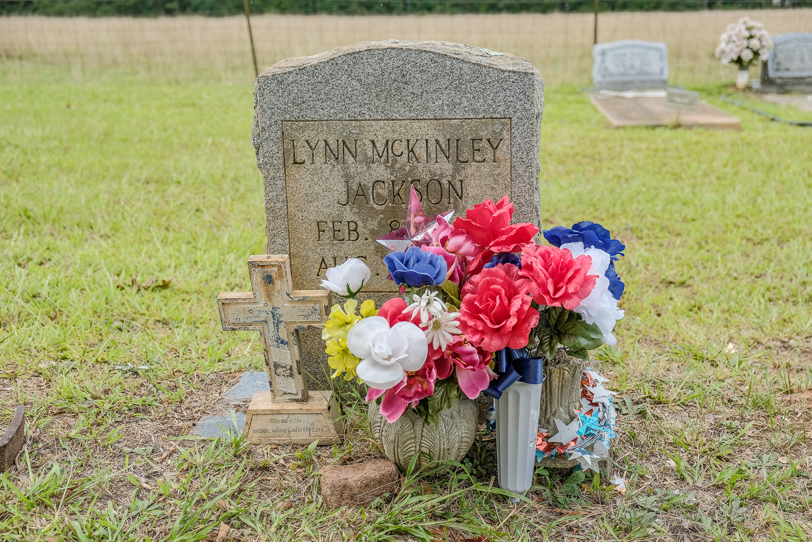 Several miles from the gravestone of George and Dorothy lies another tombstone, propped atop the more recently dug grave of Lynn McKinley Jackson, a 23-year-old army private and native of Monroe, whose decomposing body was found hanging from a pine tree in the woods outside Social Circle, a city in Walton County, in 1981.