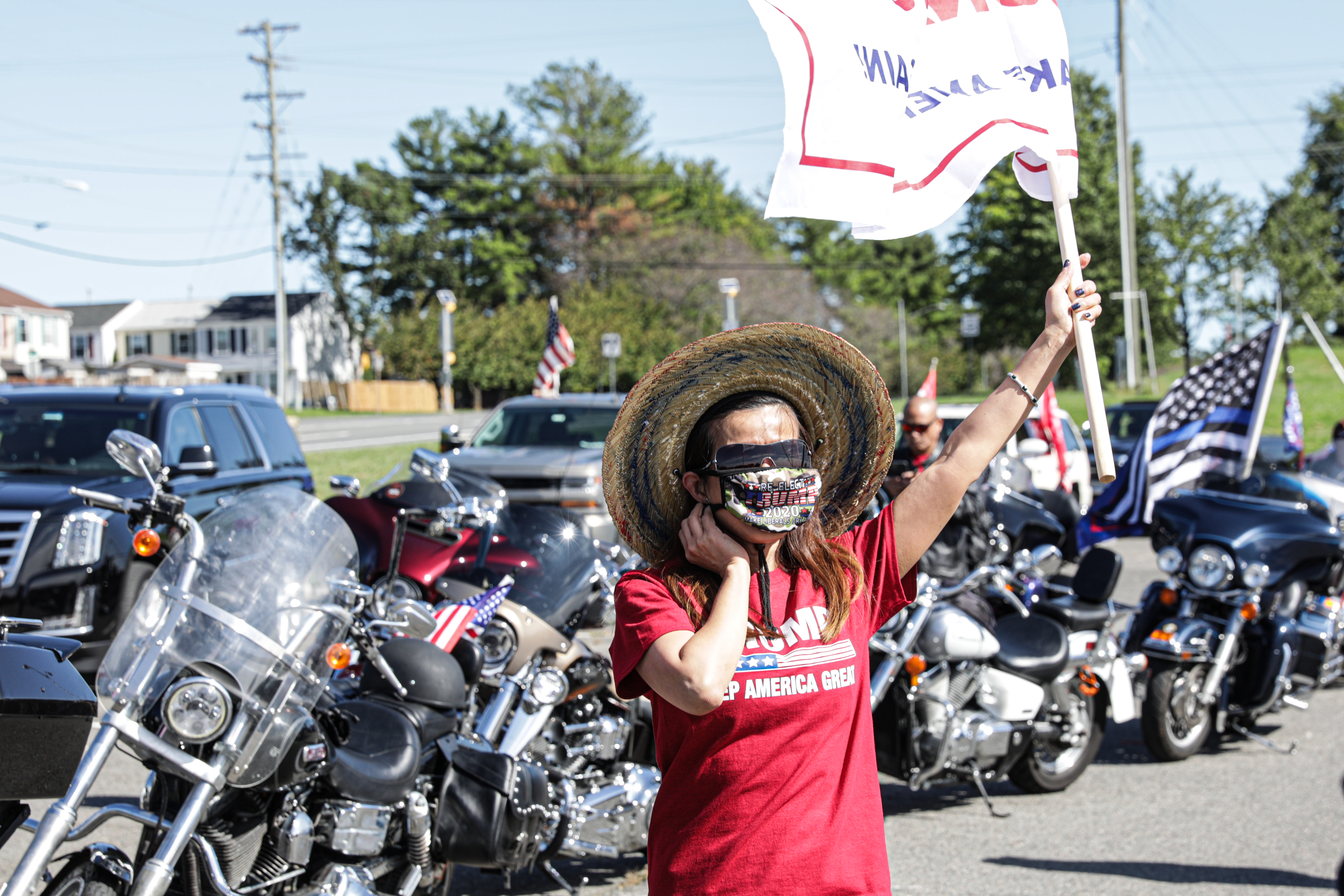 She stands near her car, which is adorned with a “Women for Trump” sign and US flags, and is parked in a high school parking lot in Manassas, Virginia on a September morning where a “Trump Train” parade is about to take off. The crowd in the background chants “USA! USA! USA!”