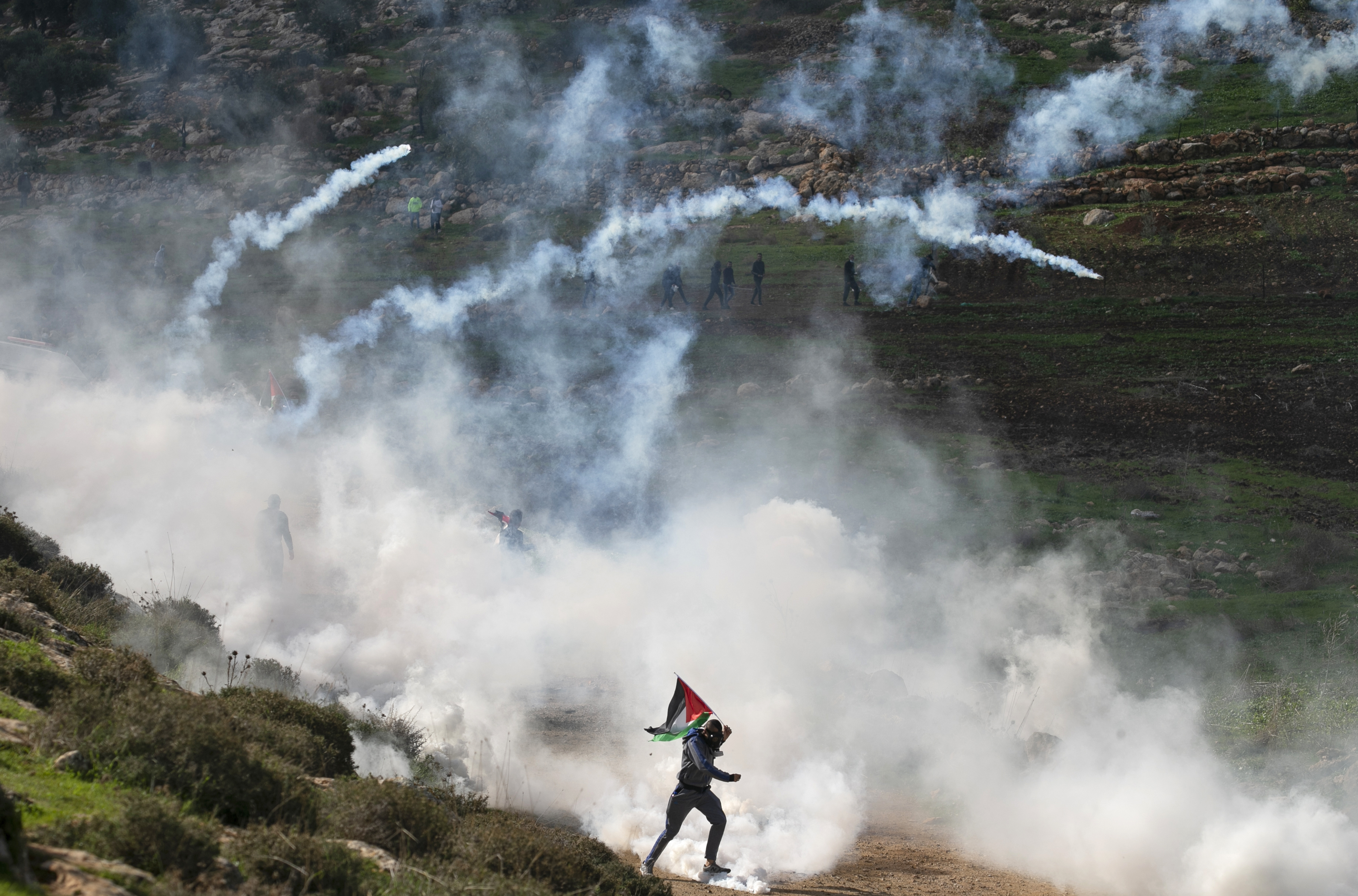 Palestinian protesters run for cover from tear gas canisters fired by Israeli forces during a demonstration against the expansion of illegal settlements near the occupied West Bank village of Beit Dajan, east of Nablus [Jaafar Ashtiyeh/AFP]