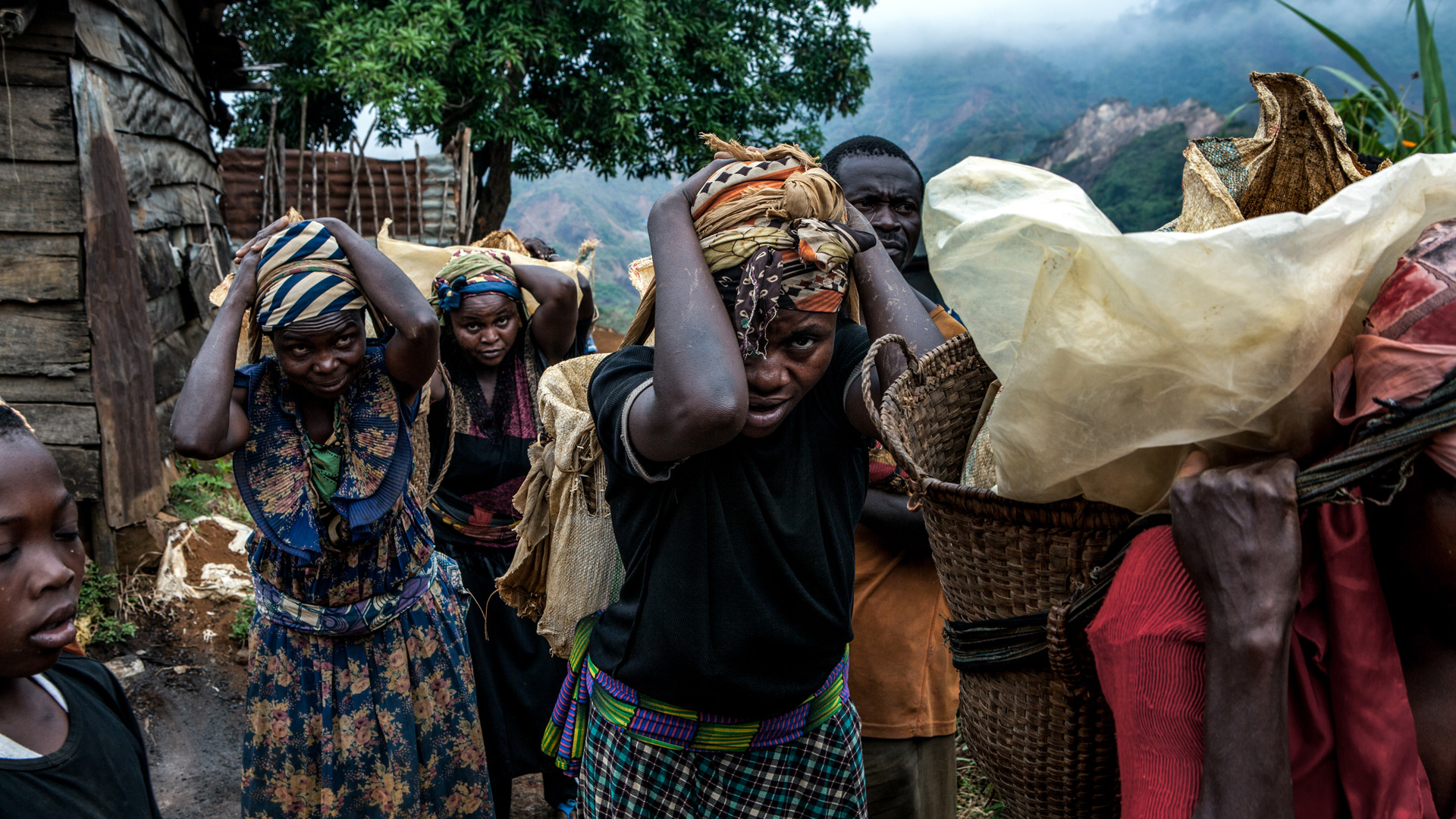 Beside her, the other women do the same as they make their way from the bottom of the valley, up a steep and slippery pathway of mud and rocks, towards the top of the Kamituga mining site in eastern Democratic Republic of the Congo.