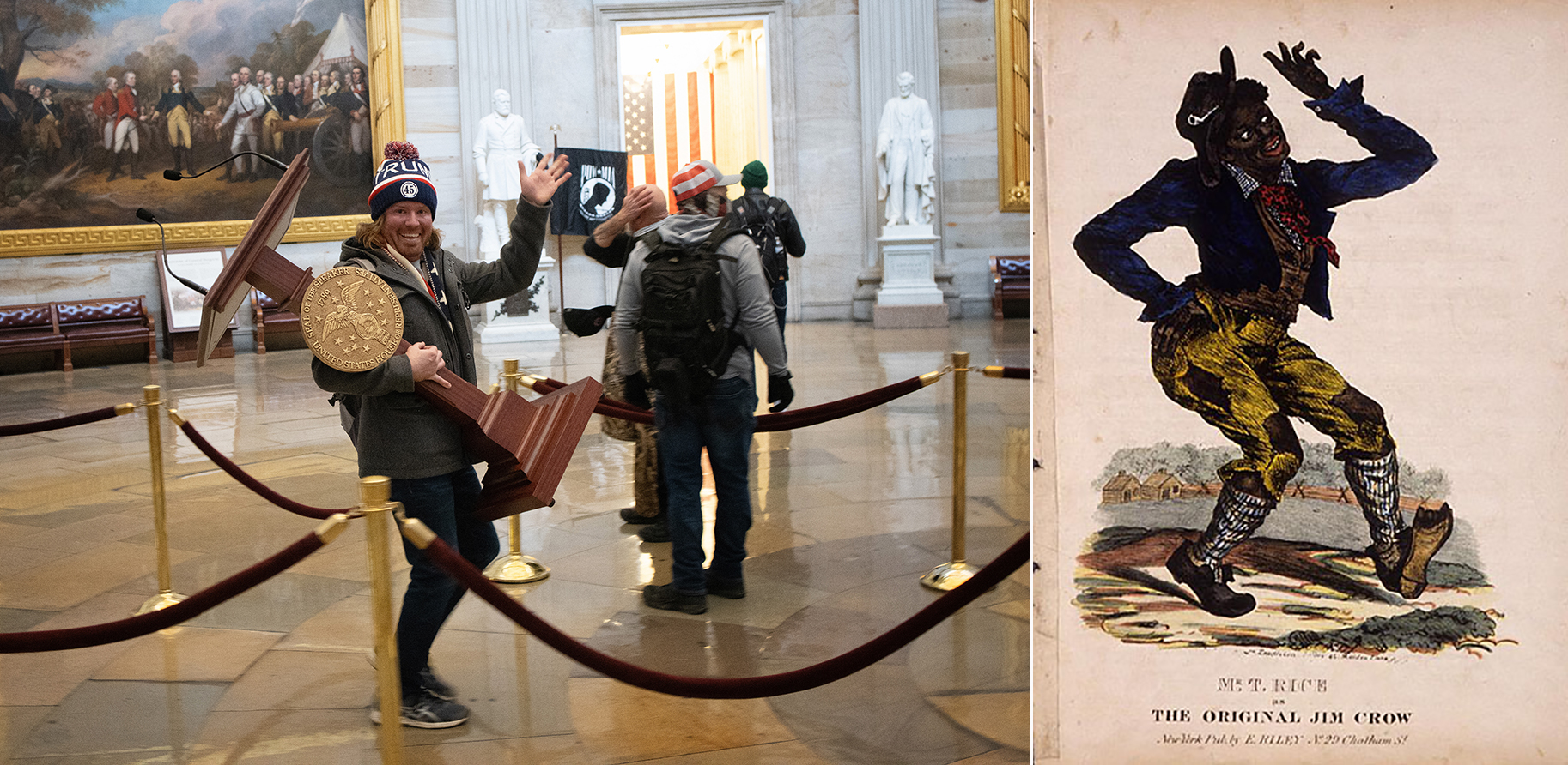 In the midst of looting, Adam Johnson flashed a bright smile and waved to the camera. With the speaker of the House’s lectern in tow, his comportment, scholar Matthew D Morrison has noted, bears an uncanny resemblance to the iconic image of TD Rice. A New York performer and playwright, Rice was the “original” Jim Crow who, by “blackening up”, started America’s long tradition of blackface minstrelsy.