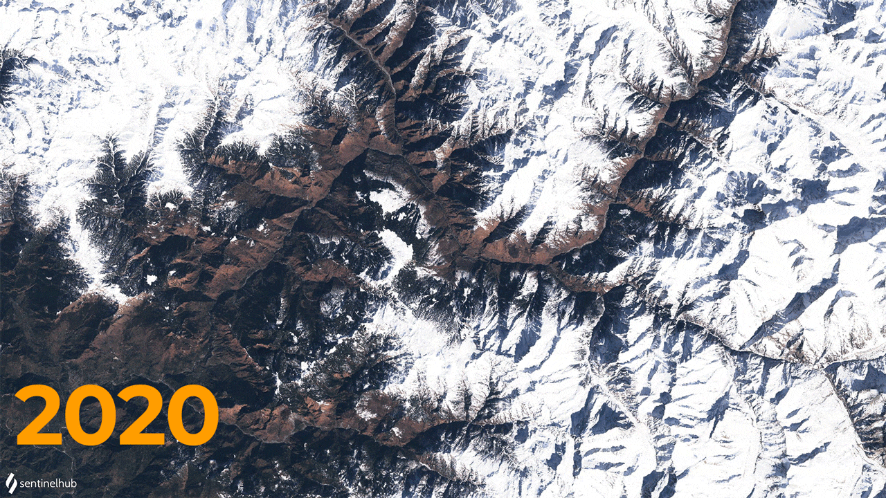 By mid-summer 2020 the seasonal cover had melted, leaving behind only perennial snow and glacier ice. Most of the summer melt will have returned into the water cycle, but the bumper seasonal coverage also suggests a disproportionate amount of water will have found its way into the crevasses of Nanda Devi’s glaciers.