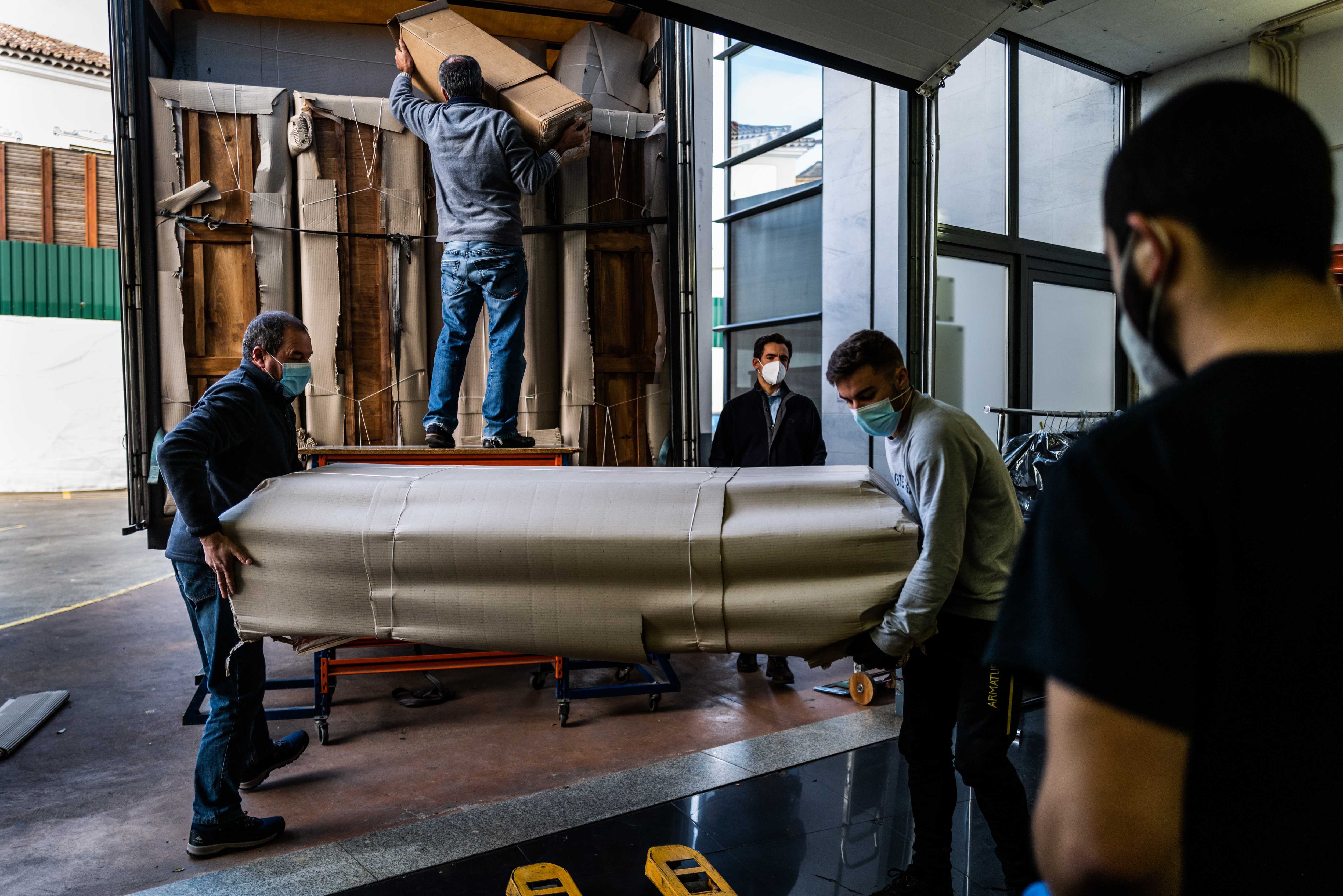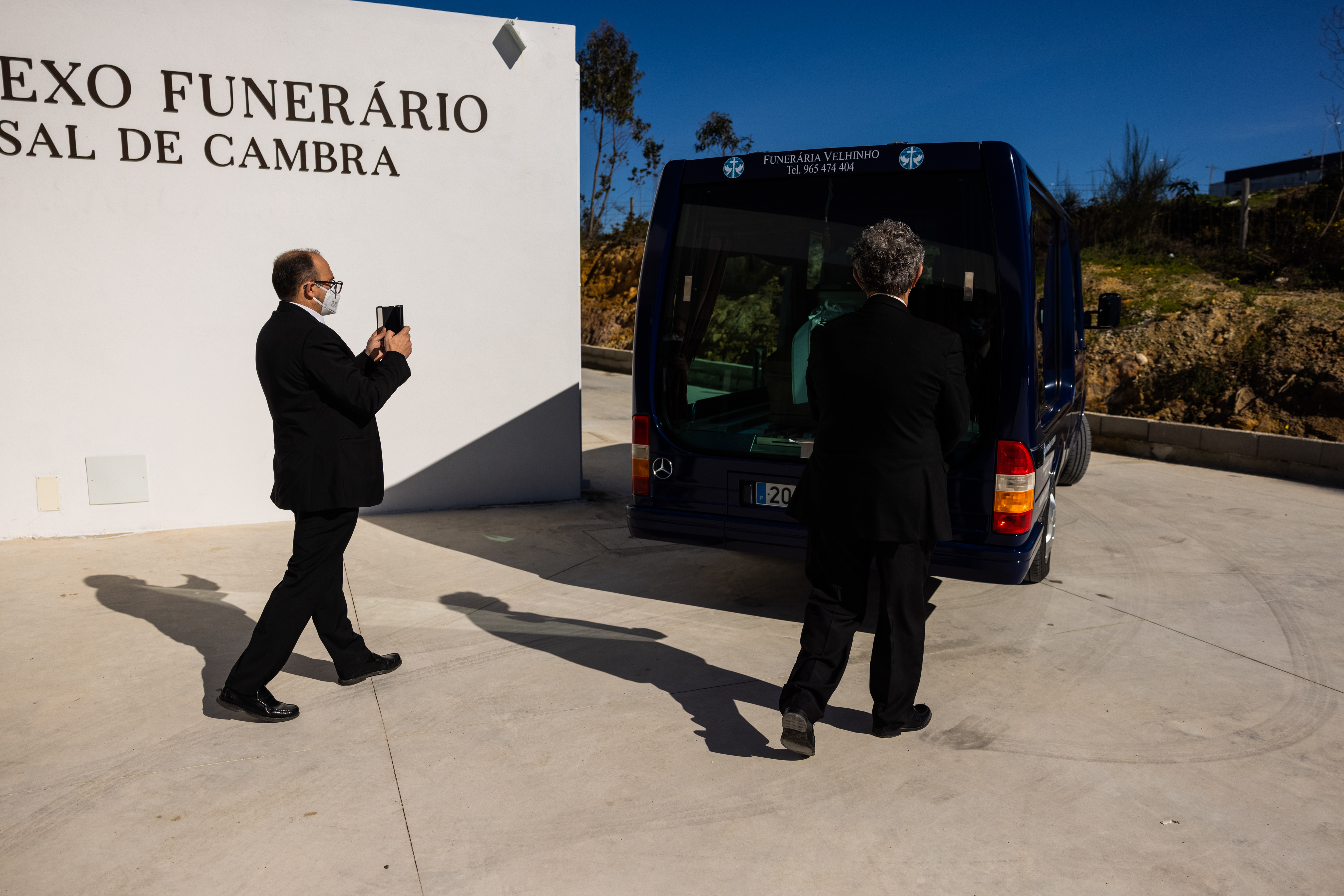 In another ceremony in Lisbon, Artur Palma, the owner of Funeraria Velhinho, raises a phone to record the scene – a coffin being transported in a van en route to the crematory.