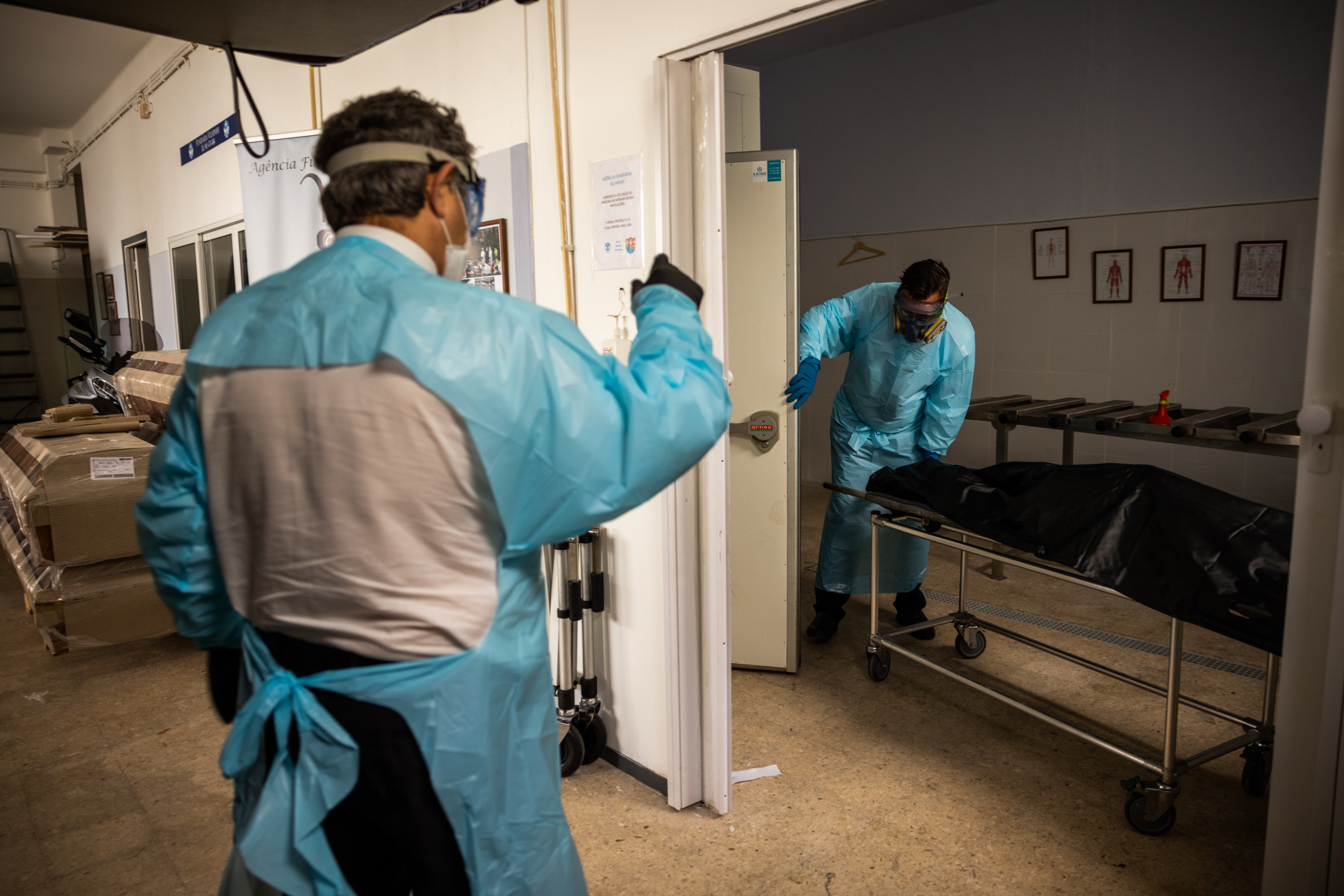 Lisbon, Portugal – Jose Santos and Eduardo Martins load the body of a woman into a mortuary freezer.