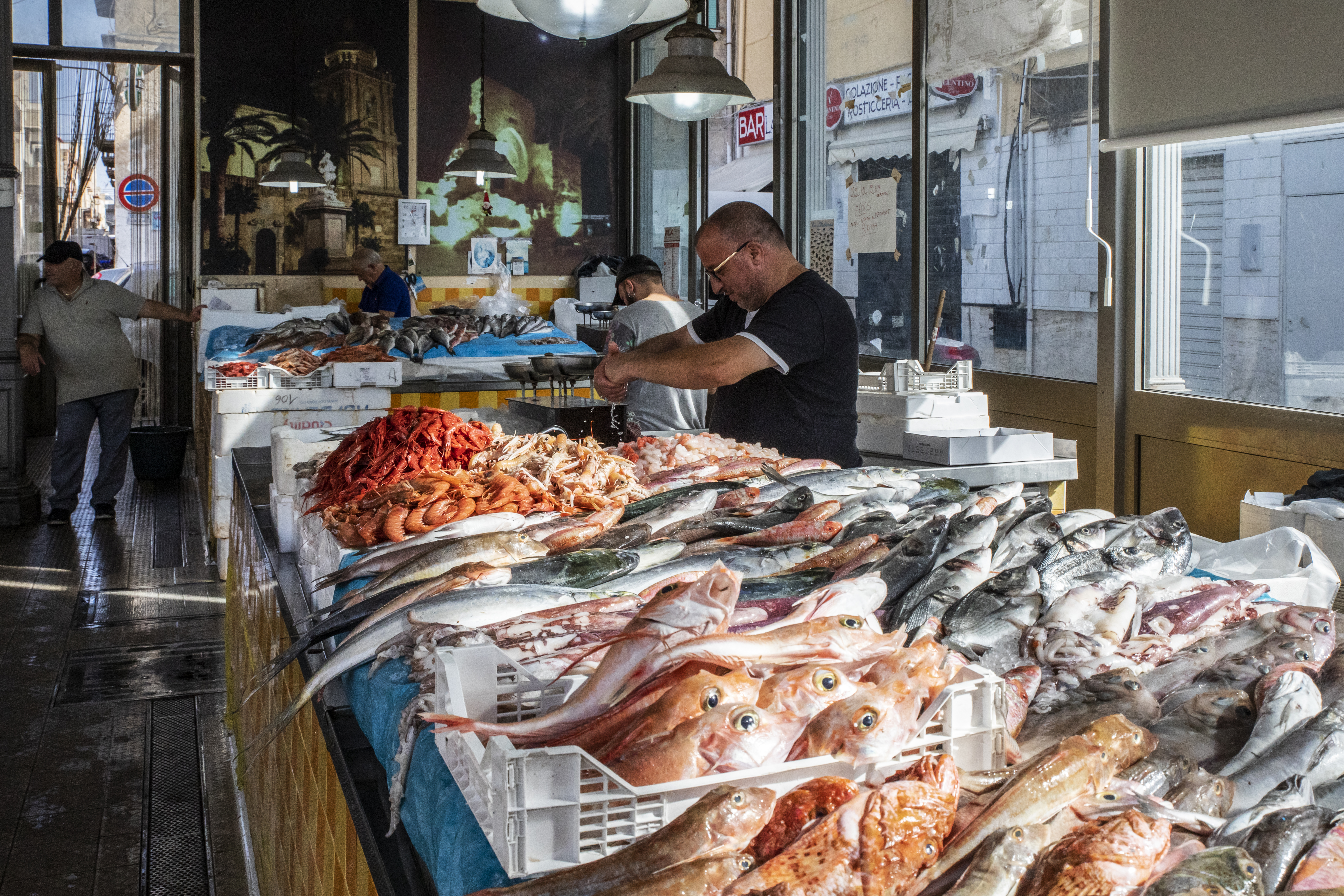 “Look! Red like the blood it takes our men to bring them here,” says Nicola Boccellato, as he lays out red prawns – 1kg for 50 euros (about $60) – on one of his stalls.