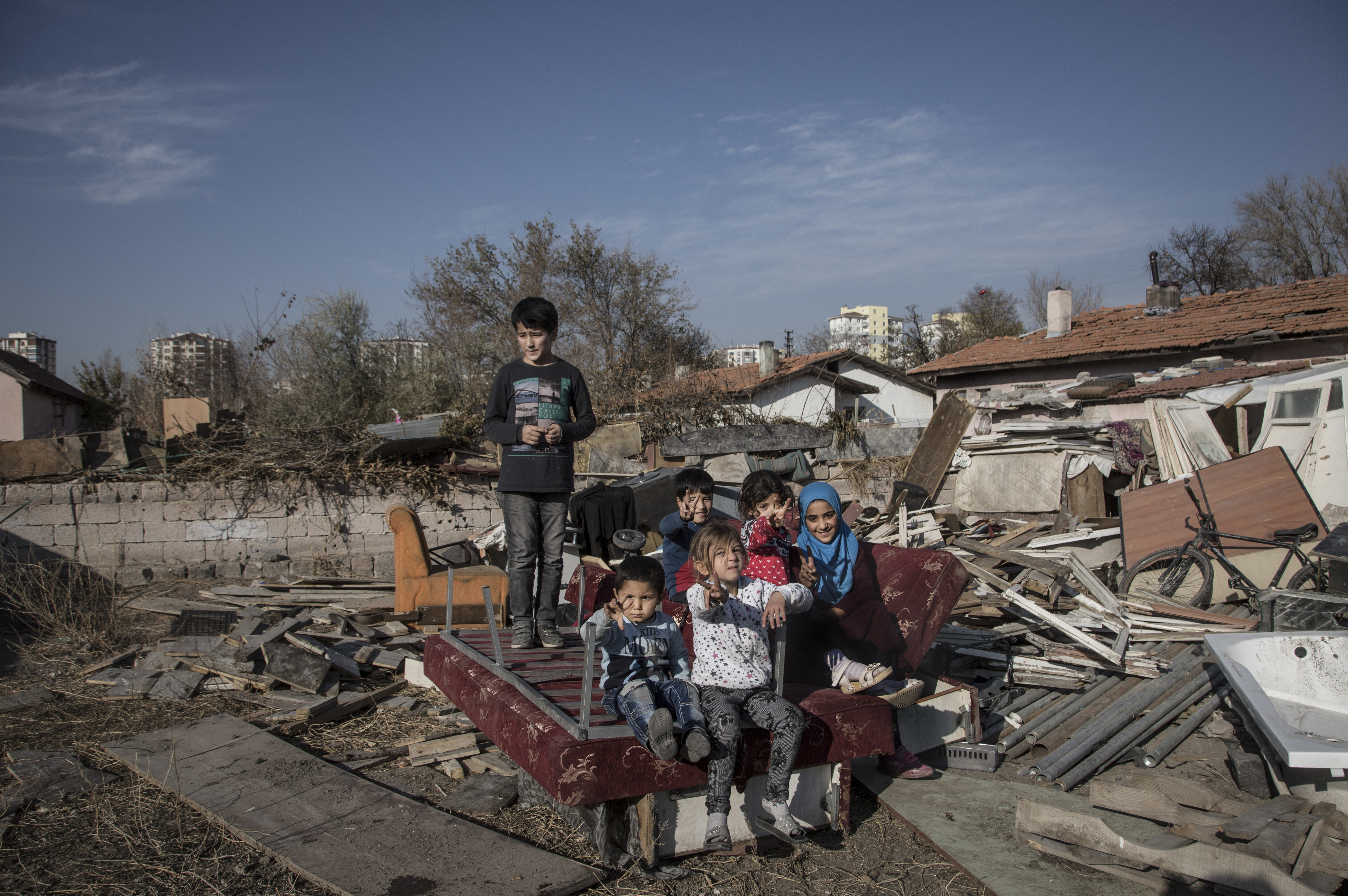 On this bright winter afternoon, after playing football, Moaaz welcomes all the other children to his family’s home. As they gather for some Turkish tea, the elders begin to arrive, sitting in the sun on makeshift chairs formed from the broken pieces of furniture Taufeeq has collected.
