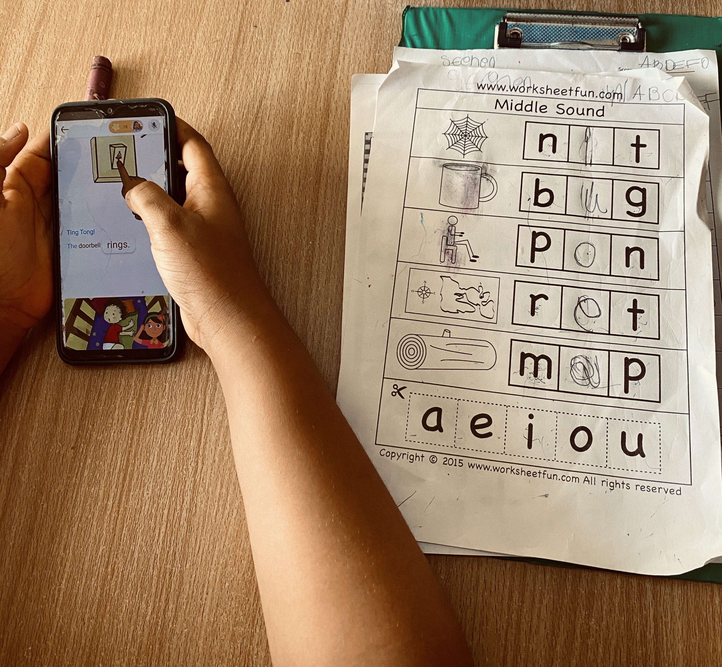 In the classrooms, different teaching methods are tailored to individual children to ensure each pupil receives adequate attention. Joseph, for instance, is unable to properly hold a pencil, but he knows how to type on the computer. In another class, a teacher explains numbers and the alphabet to a boy. He holds his hand as the child writes 1, 2, 3 on the board; then he retrieves some cards with numbers written on them and tells the boy to identify each one as he dictates. For another child, a teacher uses a tray with salt, watching as the boy traces his finger on it; then she holds his hand to help him write more legibly. For another, the boy uses a pencil to write in a book as his teacher calls out the letters of the alphabet and then holds his hand to steady his writing. A girl uses a phone to play an educational game that displays objects and their names.