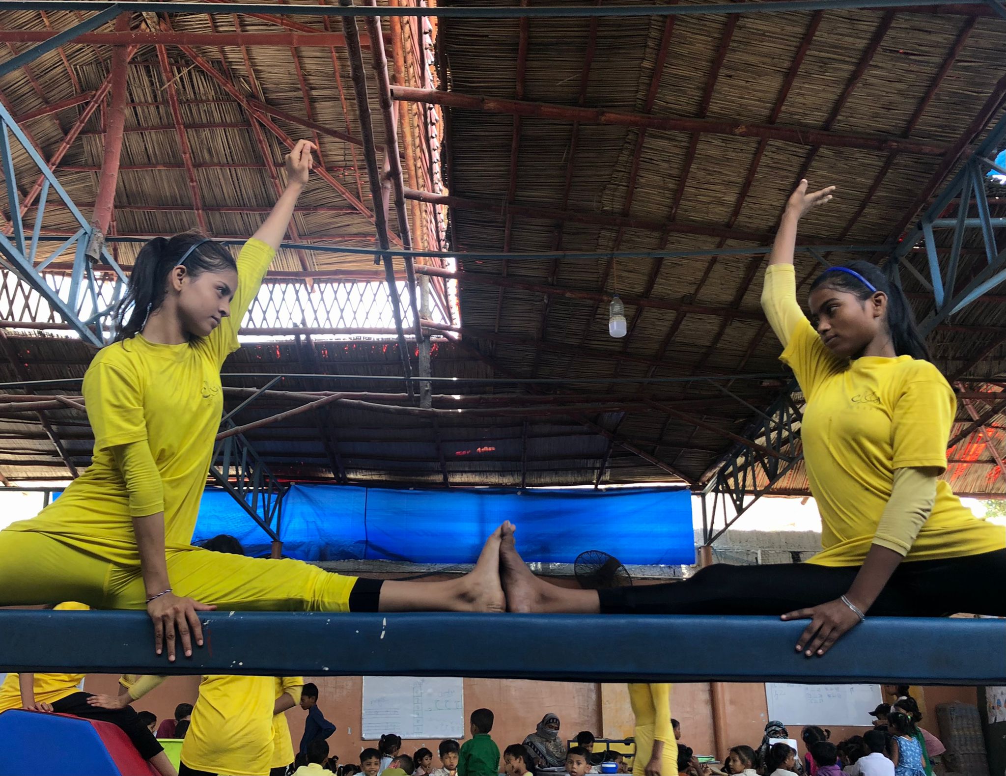 Stateless Bengali, as well as Pathan children, wearing yellow tights and shirts, aged five to 15, rigorously perform acrobatic moves with the help of their coaches.