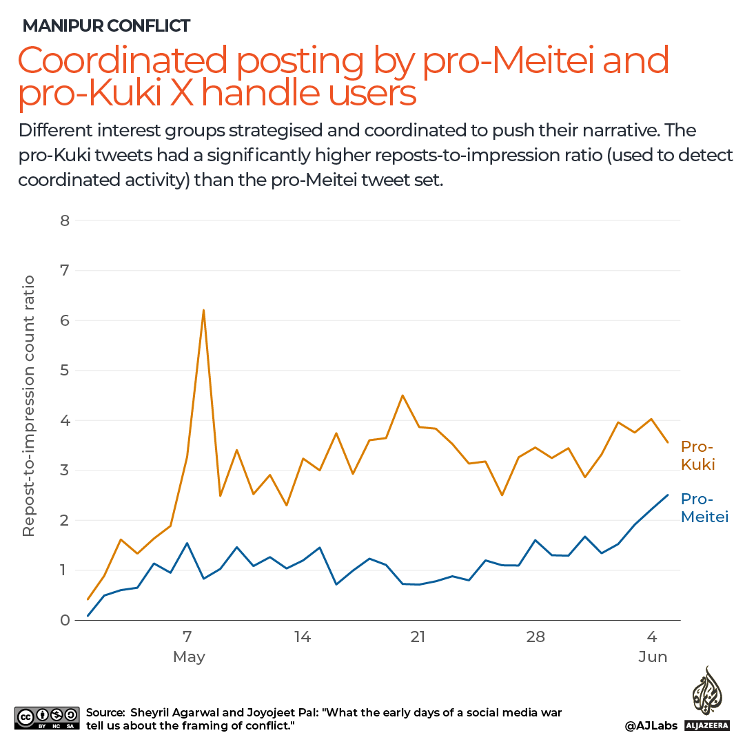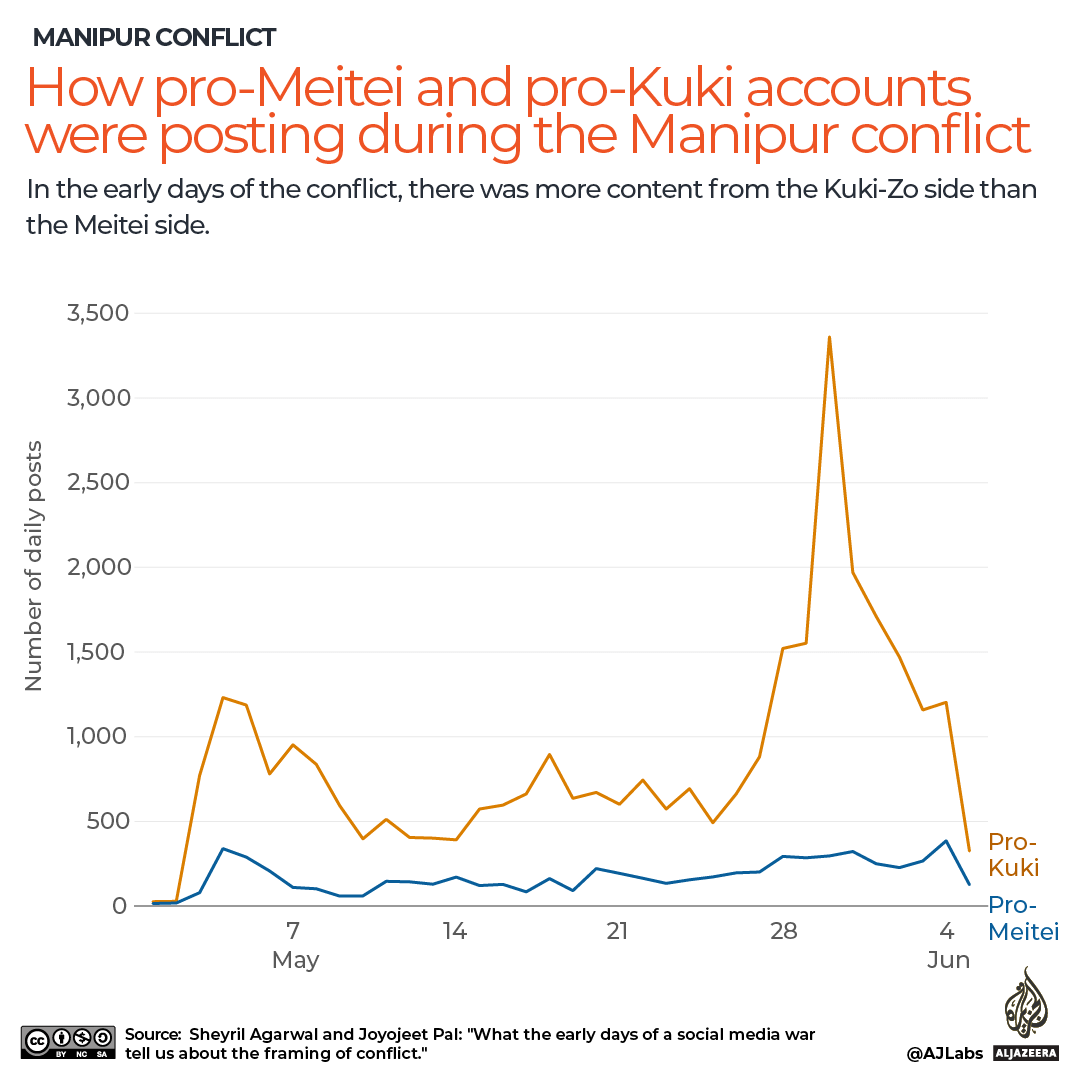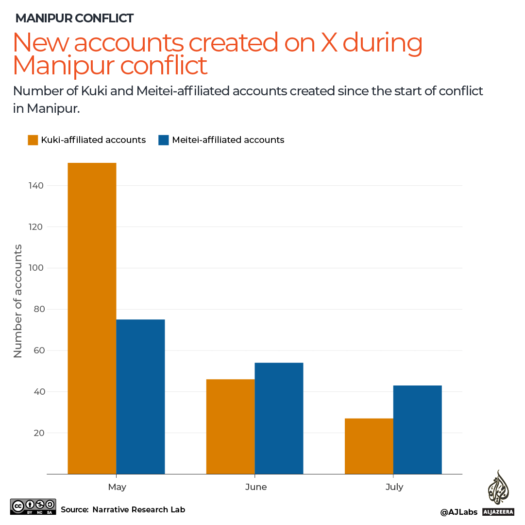 For instance, they said, 86 new accounts with high activity from the pro-Kuki-Zo side were set up in the first week of May. Pro-Meitei content saw 24 new accounts.